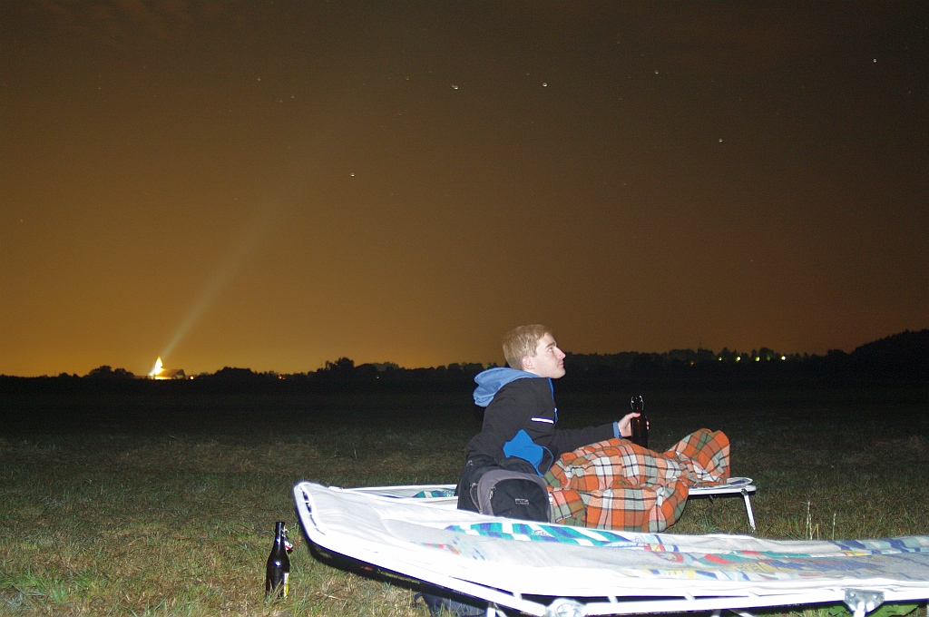 Nachher gehts mit dem Auto und Klappliege aufs freie Feld raus, da hats weniger Lichtsmog. Wetter schaut grad gut aus. Junior fährt, dann darf ich mir ein lecker Bierchen dazu gönnen. ok, Bier ist gebongt. Hmmmm, dann schon nach der zweiten nur noch Schweinkram