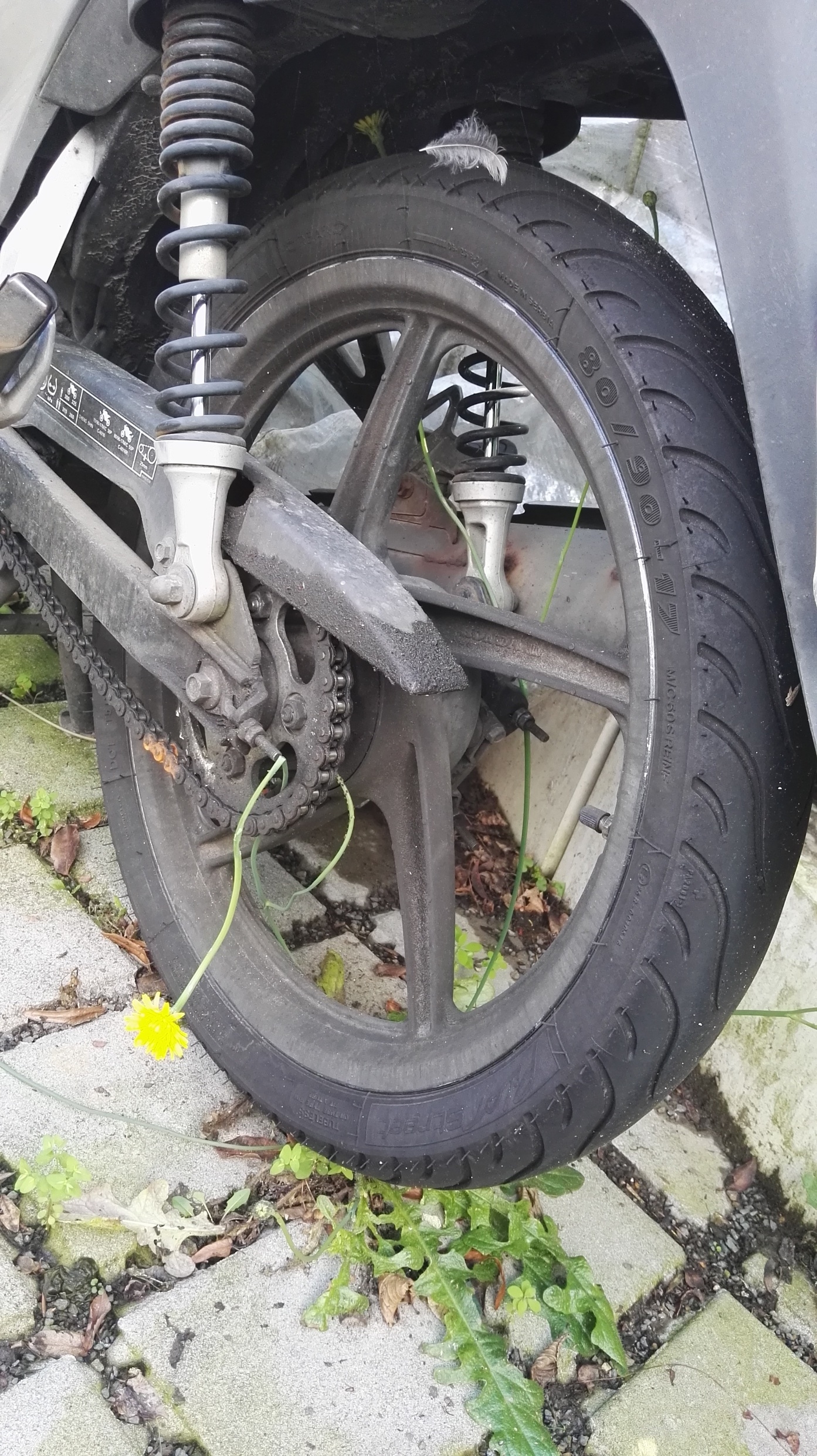 ich hatte meine wave vier wochen alleine gelassen. als ich sie wieder reiten wollte, musste ich sie aus den fängen eines löwenzahns befreien. der war in der zwischenzeit durchs hintere kettenrad durchgewachsen: