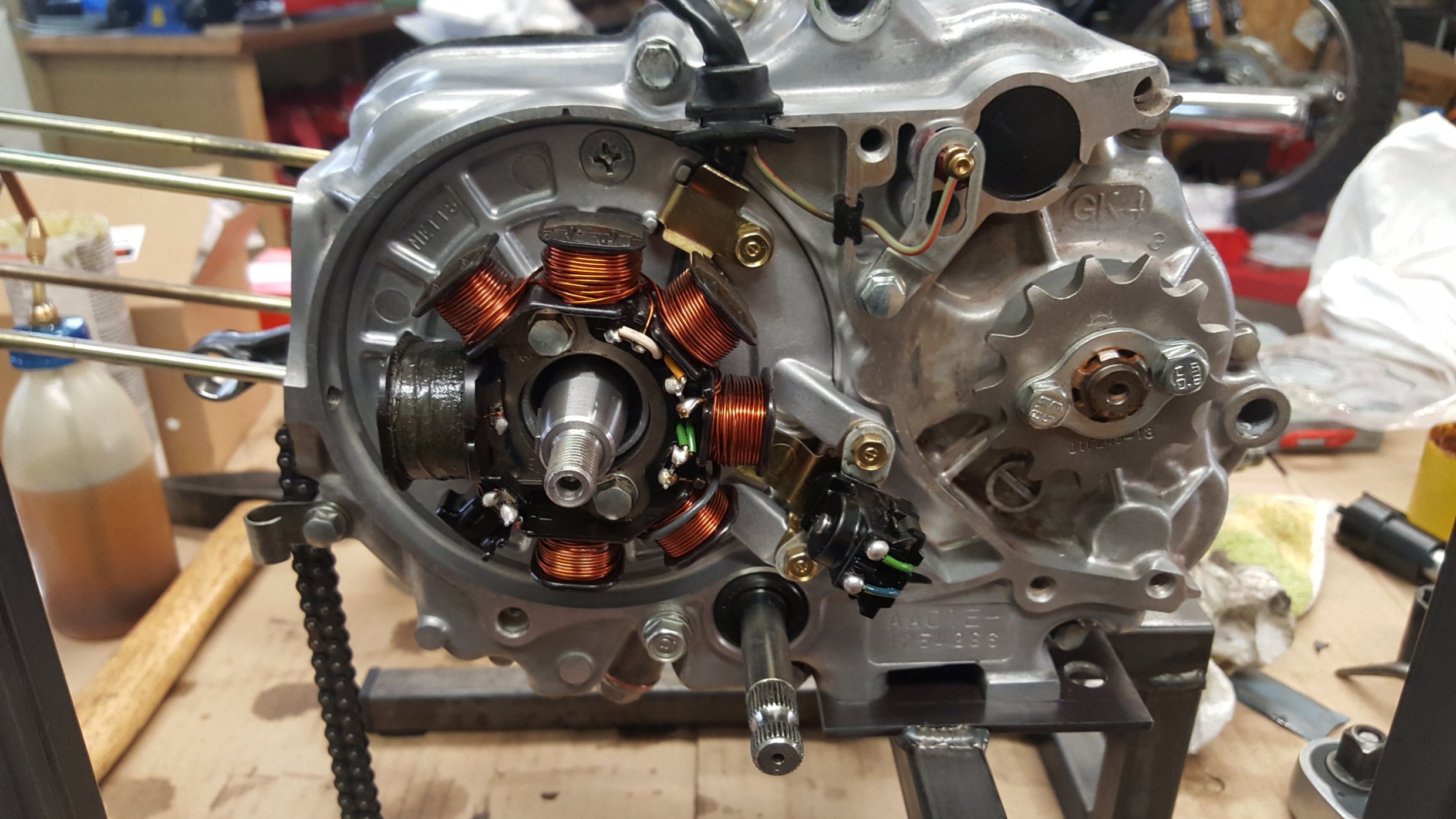 Im vorliegenden Fall wurde auf jeden Fall schon einmal das Getriebe überholt und die Gummiräder der Steuerkette, Kolben und Zylinder passen nicht zu den restlichen Teilen was den Verschleiß an geht. Ein Indiz für einen zerlegten Motor ist oftmals die Dichtungsfarbe und der Dichtungszustand und z.B. etwas Fett im Bereich der kleinen O-Ringe zur Befestigung der Zündungsgrundplatte.