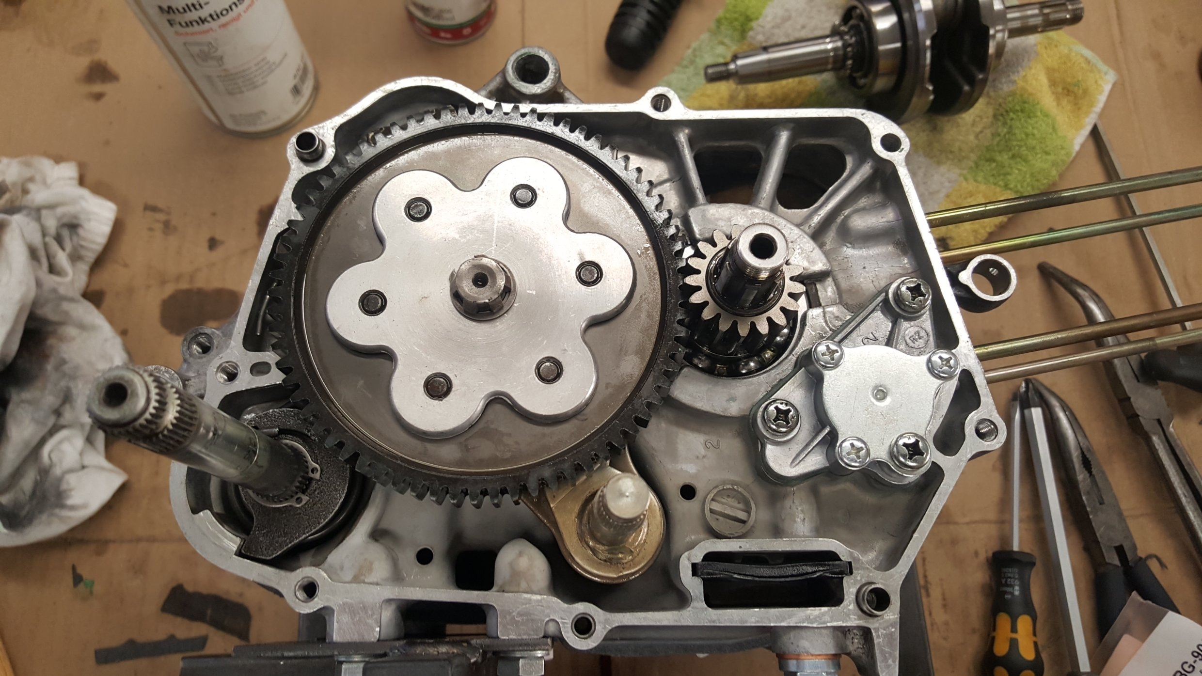 Hier hab ich eine neue +100% Ölpumpe und ein neues Ölsieb verbaut. Die Betätigungsmechanik von Schaltwalze und Kupplung ist in der Regel, wie hier im Fall, unauffällig und konnte wieder montiert werden.