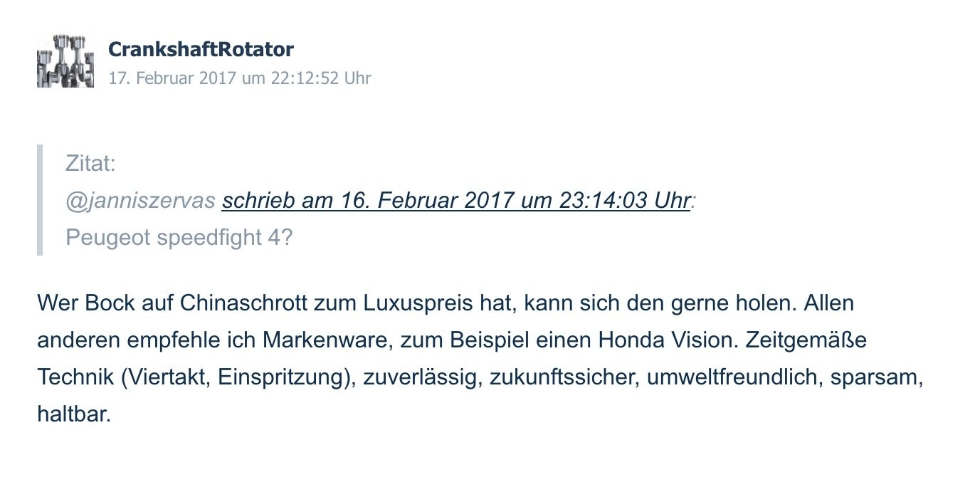 Natürlich kann man in China Qualitätsware produzieren. Man muss nur bereit sind für die Endkontrolle und Schulungen zu bezahlen. Letztlich kann man jeden Menschen für jede beliebige Tätigkeit anlernen. Glaube ich... Honda steht bei mir auch nicht auf dem Motor. Ist das bei anderen Honda-Rollern der Fall (gewesen)?