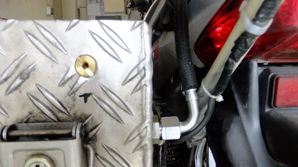 eingebaut ist eine Hardi Membranpumpe 12V 2A /110 Ltr./h. Im Saugstutzen ist ein Saugrohr angelötet und reicht bis zum Tankboden. In der Saugleitung vor der Membranpumpe sitzt der Filter. Die Tankentlüftung führt nach hinten aussen und ist vom Kofferdeckel abgedeckt. Die Druckleitung von 0,3 bar führt über eine Schottverschraubung zum Inno Tank. Den Tankdeckel habt ihr schon gesehen. Die Innotankentlüftung ist unter der Sitzbank.