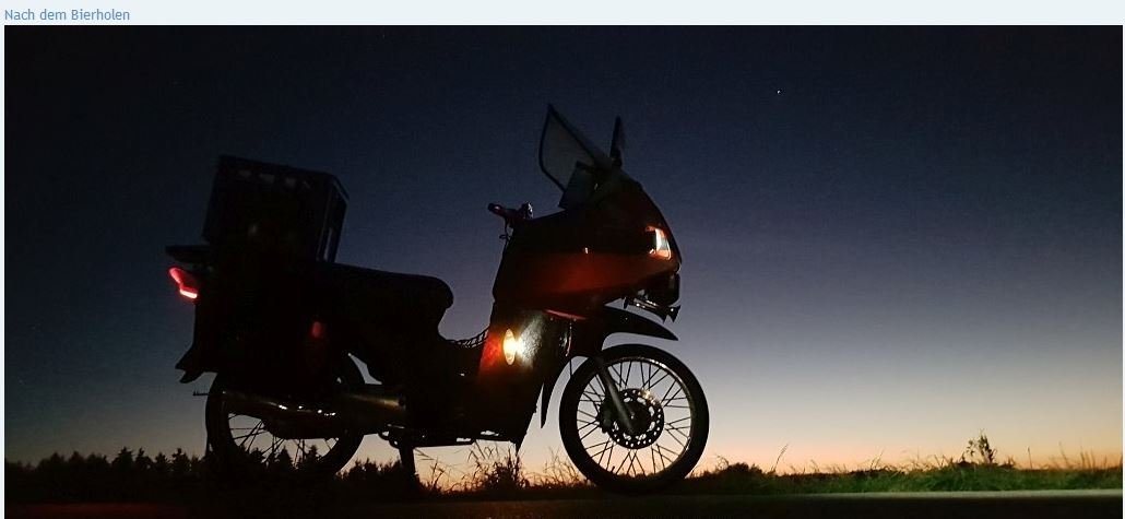 ich muss sagen ich versteh deinen gedanken zu dem moped und auch das thema des energiesparens sehr gut . aber so langsam kommst du an eine Grenze wo du dir wirklich überlegen musst