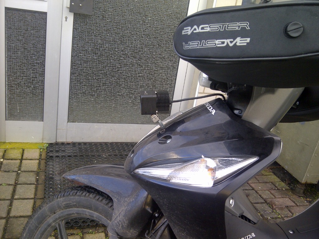 Ich habe mir eine LED-Arbeitsleuchte angebaut und bin sehr zufrieden. Das dunkle Loch zwischen Vorderrad und Lichtkegel der Originallampe ist verschwunden. Das Licht streut auch genug zur Seite und man wird besser wahrgenommen. Die Eintellung muß, wie von Richard beschrieben, wie bei den Solstice erfolgen, da sonst der Gegenverkehr geblendet wird.
