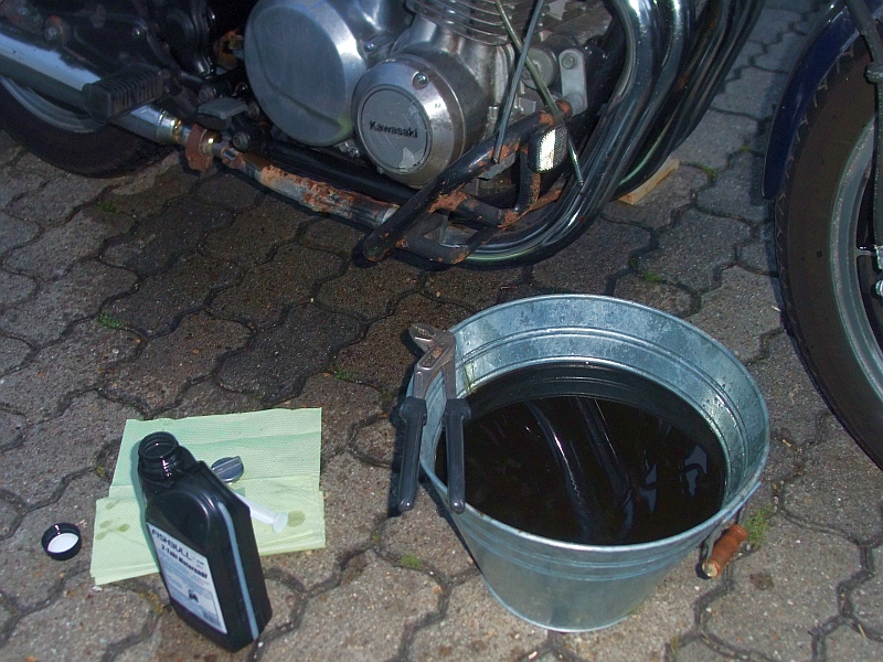 Meine Kawa hat einen 24l-Tank. Der war leer. Hier ist das was ich beim Ablassen sammeln konnte: