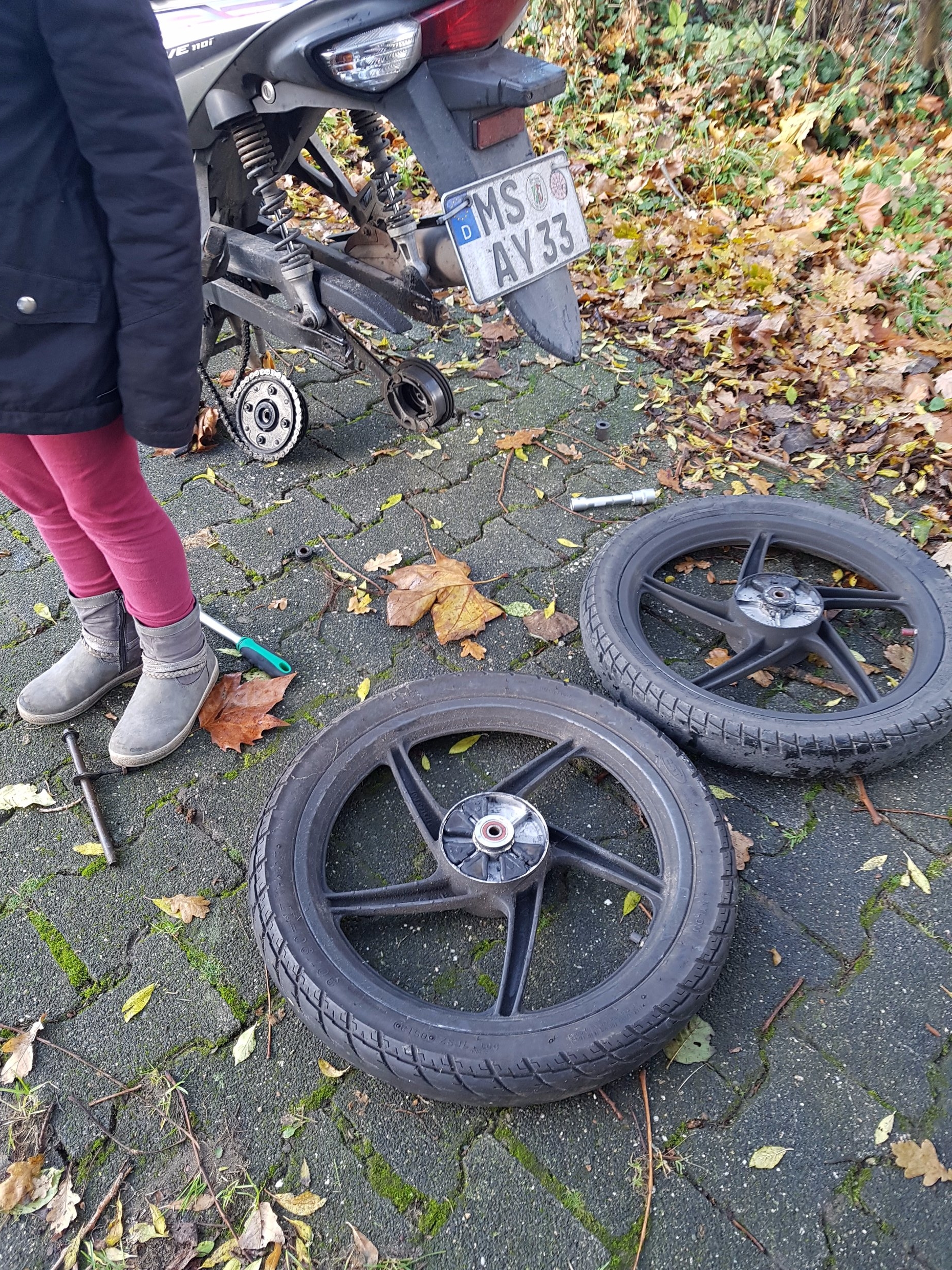 Gleich steige ich zu hause auf ein anderes Moped um. Dann werd ich mal sehen ob ich diw wave direlt heute abholen fahre oder wider meine Frau nerve und sie mich da hin fahren muss und ich nur die Ersatz - Felge umstecke.