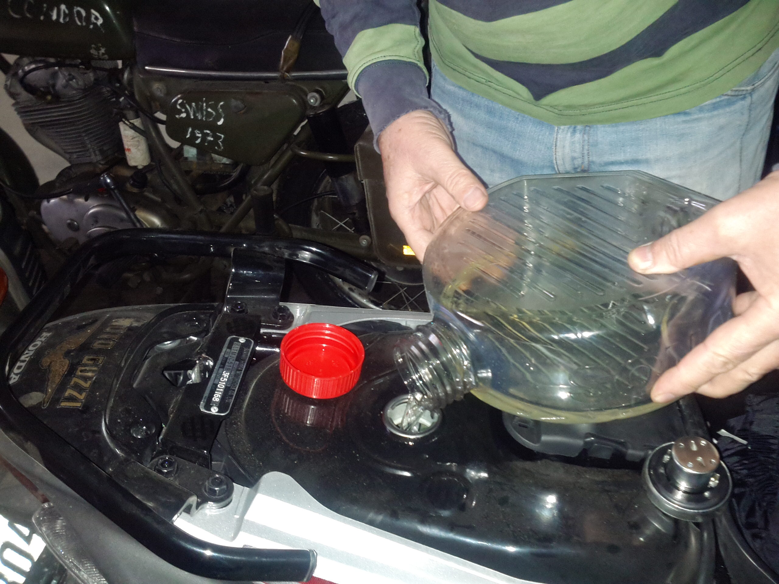 Egal, in der Tanke angekommen passten komischerweise nur 3,6 Liter in den Tank bis Oberkante Unterlippe. Entweder lag´s an der Eichung der Zapfsäule oder es war noch eine Restmenge im Tank an der die KS-Pumpe nicht drankommt oder mein Tank ist ein weng kleiner wie von Honda angegeben.