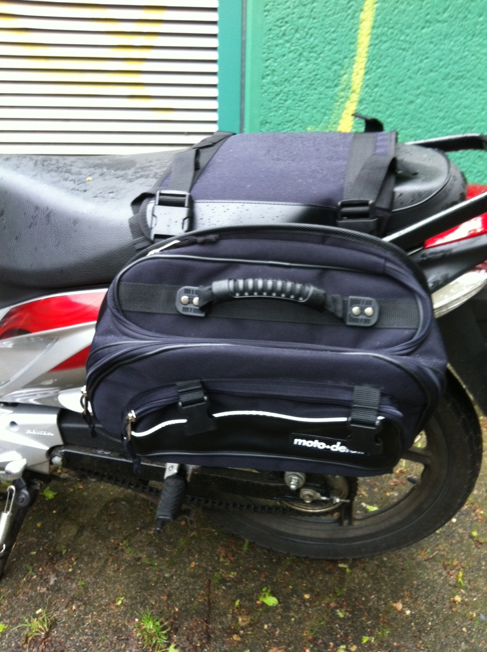 Ich hab die Tasche erst mal über die hintere Sitzbank hängen lassen. Überlege mir noch ob ich ein Abstandshalter nehmen soll. Auch so kommt die Tasche mit dem Hinteren Rad nicht in Berührung (bis jetzt), es wird aber etwas dreckig.