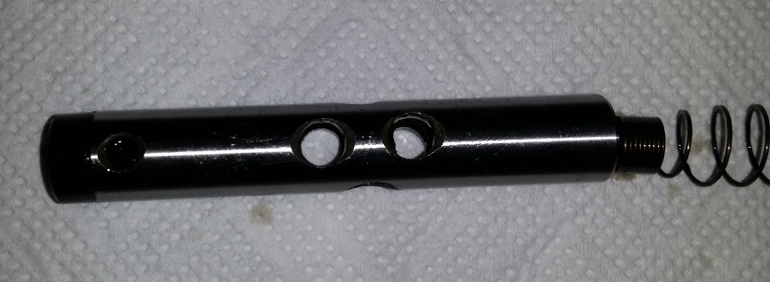 Leider kam keine Menge (nur paar Spritzer) Öl raus, sondern eine ca. 10cm lange Feder und darüber ein etwa 10cm langer Stahlbolzen mit vielen Löchern drin.