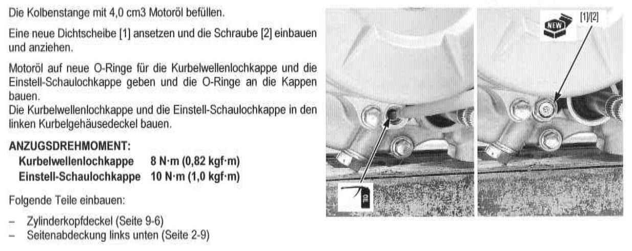 Die Steuerkette wird bei der Wave über einen Hebel mit Zahnrad gespannt. Der Kolben mit Feder wirkt auf den Hebel. Das Öl dämpft den Kolben wie Atomo geschrieben hat. Das Problem scheint zu sein, die Luft aus der Kammer über die Einfüllbohrung herauszubekommen und die 4 ccm Öl hinein.