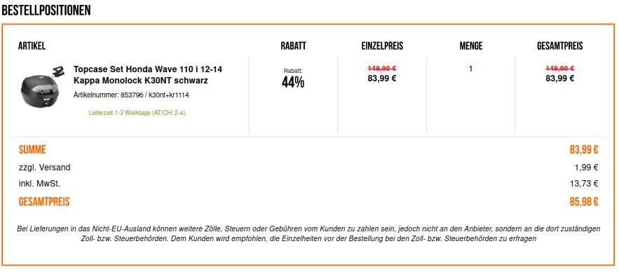 Das Set bestehend aus 30l Topcase und dem Träger hat incl. Versand 86€ gekostet.