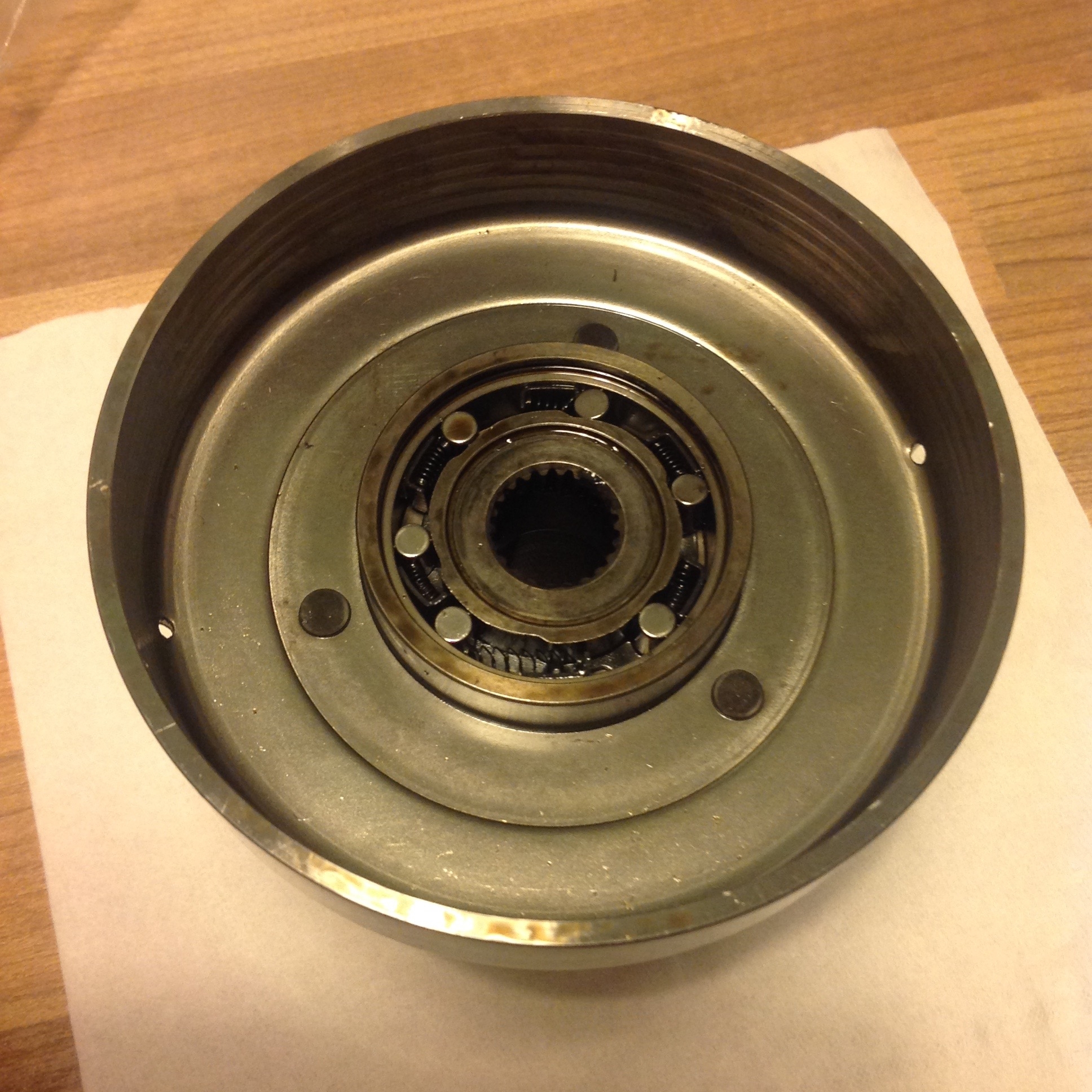 nach einigem hin und her hatte ich mich entschieden, nicht selbst zu schrauben, sondern habe den örtlich ansässigen honda-heiler mit geld bestochen, meiner welle die hand aufzulegen. seine diagnose war: die fliehkraftkupplung flieht und kuppelt, das problem liegt dahinter, er nannte es freilauf. er hat also das gesamte bauteil (siehe zweites foto, es heißt laut rechnung »outer assy, primar«) ausgewechselt. auf dem ersten foto sieht man innen das gekröse mit den federchen, das wohl das problem verursacht hat.