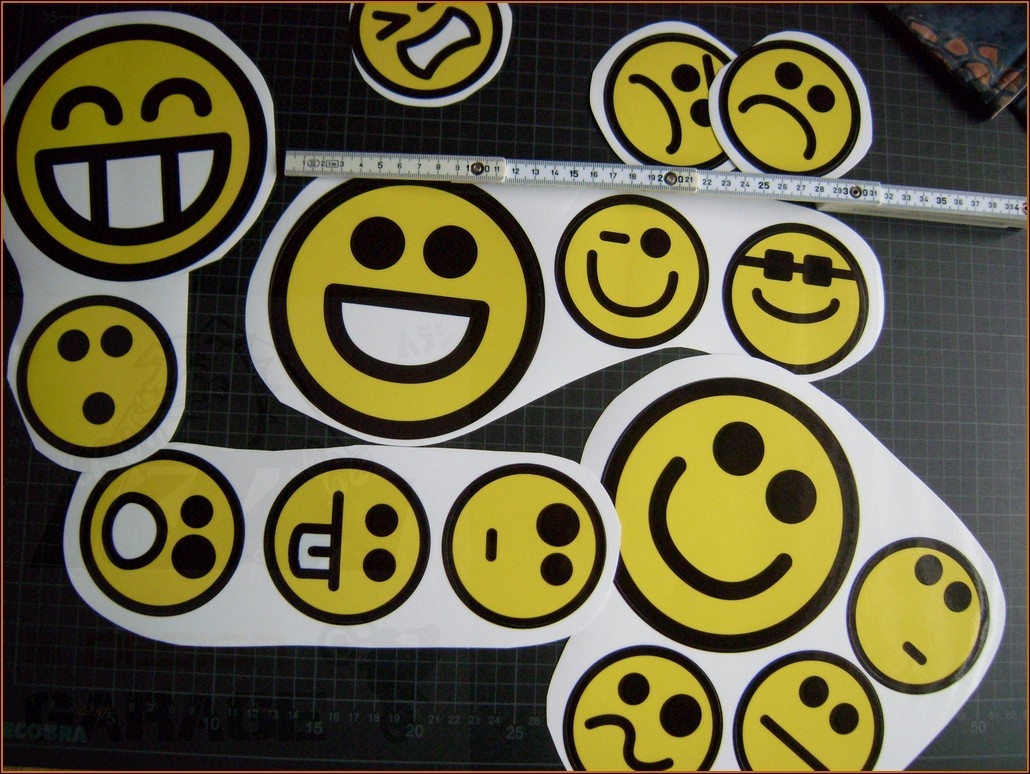 3 Smilies mit 14cm Durchmesser und 8 Stück mit 10cm Durchmesser.