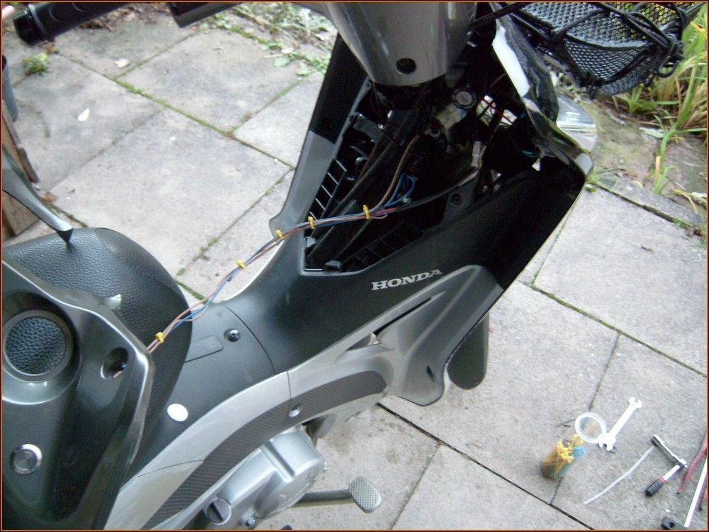 Dann habe ich mir dazu einen trennbaren Kabelbaum gelötet mit wasserfesten Steckern von alten Blinkern. Den Schalter habe ich rechts neben das Zündschloss gesetzt, so kann ich auch bei Tag kontrollieren ob das Licht an ist