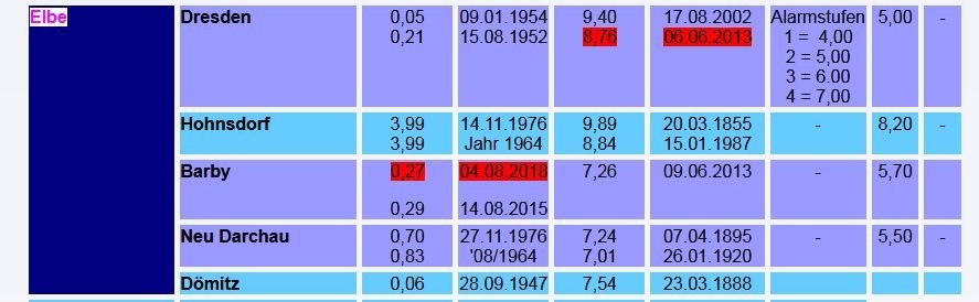 Spalte 3 zeigt die Niedrigsstände der Elbe und Spalte 5 die Höchststände!