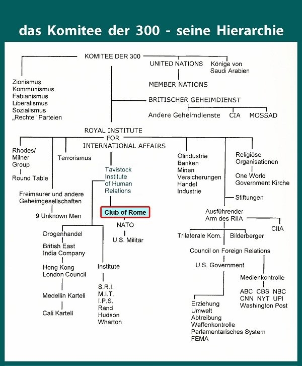 Der „Club of Rome“ wurde 1968 auf dem privaten Anwesen von Rockefeller in Bellagio (Italien) gegründet (mit z. B. Rockefeller, Al Gore, Bill Clinton, Maurice Strong (der Organisator des ersten Klimagipfels in Rio), Ted Turner (CNN-Chef) und Gorbatschow).