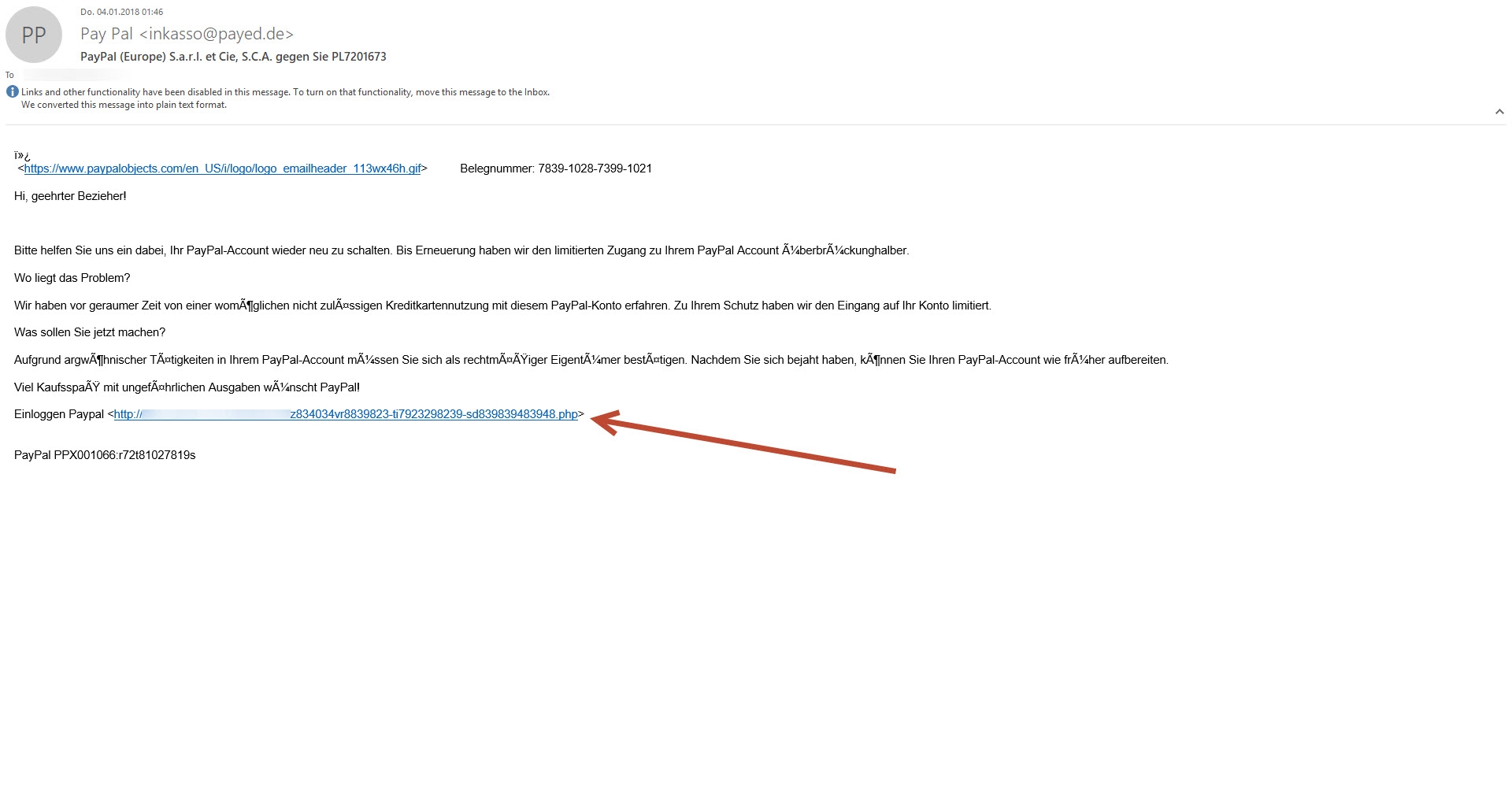 Also, angefangen hat es mit dieser E-Mail. Spam, wie die meisten ja wohl auf Anhieb erkennen können. Gespickt von Fehlern. Aber das muss nicht immer zwingend so sein. Es könnte auch in besten Deutsch, oder was für einer Sprache auch immer, abgefasst sein. Also nie auf sowas reagieren. Und wenn man in Zweifel ist ob mit der im E-Mail genannten Firma/Account auch alles in Ordnung ist, dann gibt man am besten VON HAND die entsprechende WWW Adresse in eine Browseradressleiste ein und loggt sich dann ein. Danach kann man prüfen ob alles in Ordnung ist oder nicht. NIE aber GAR NIE auf einen Link in einem solchen E-Mail klicken!!!!!!!