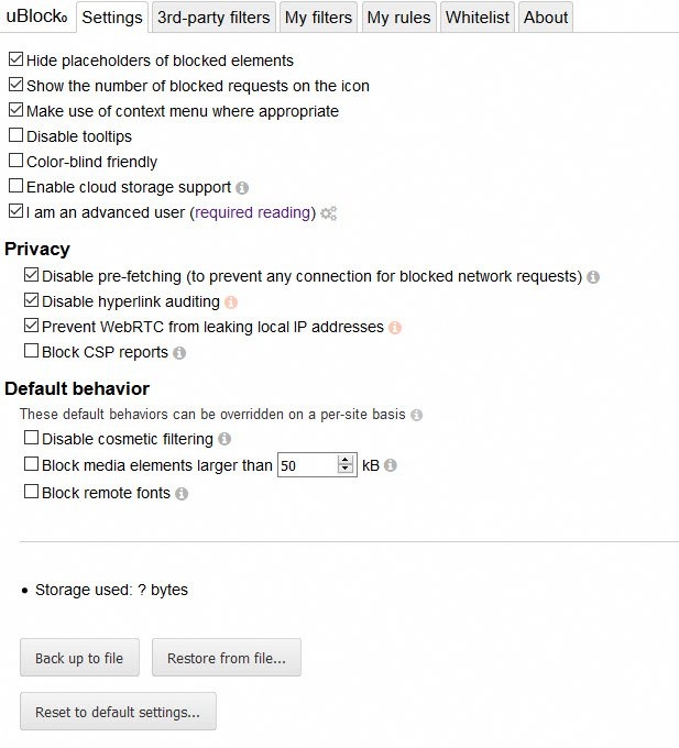 Das ist meine uBlock Konfiguration (Settings); Wichtig ist dass man in der Gruppe "Default behaviour", bei "Block remote fonts" KEIN Häckchen setzt! Sonst gibt es, zum Beispiel hier im Forum, Problem mit der Anzeige.