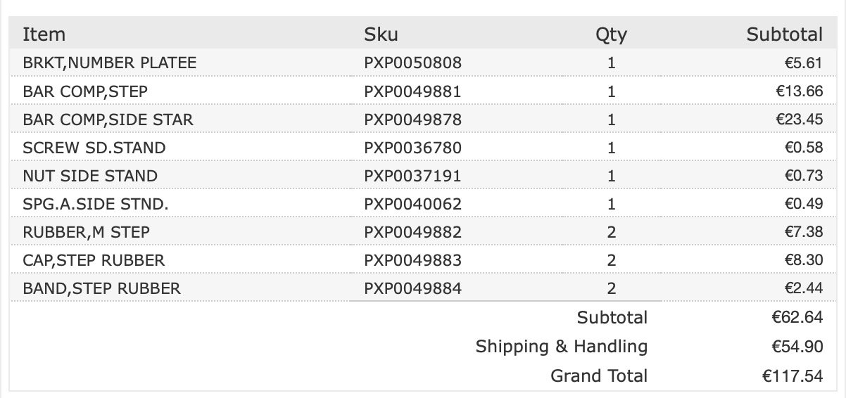Meine Bestellung in Thailand kostete rd. 117 Euro, hinzu kamen rd. 22 Euro Einfuhrumsatzsteuer, Zollgebühren fallen unter 150 Euro nicht an. Ich habe aber nicht alle Teile aus meiner Auflistung bestellt, die vier Senkkopfschrauben und den Anschlaggummi hatte ich bei der Bestellung schlicht vergessen. Dafür war noch der Kennzeichenhalter für 5,61 Euro dabei, für den Honda Deutschland 287 Euro aufruft. Den habe ich nur aus Gaudi bestellt, ich brauche ihn nicht wirklich.