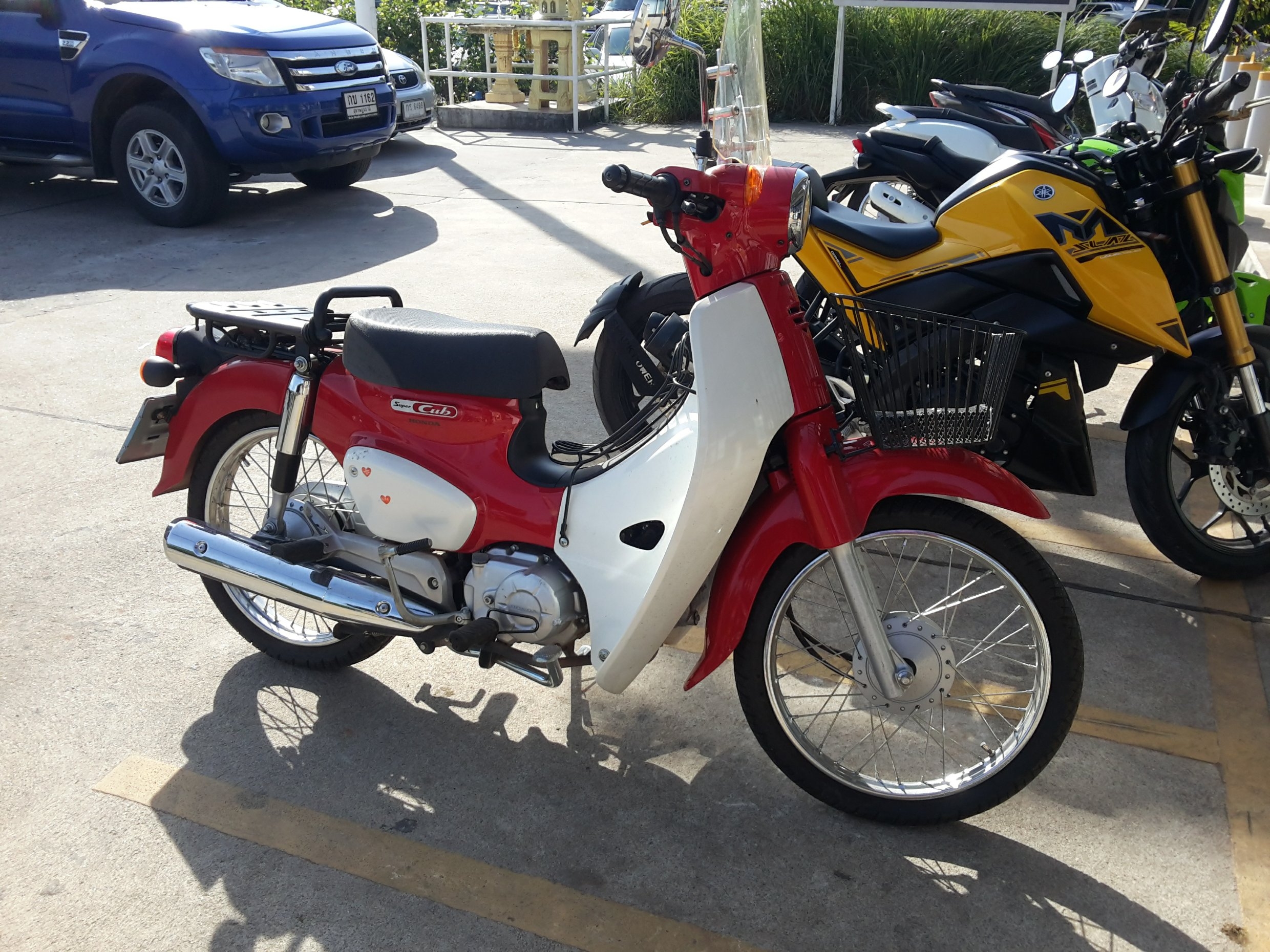 Hier sind solche "Kleinigkeiten" problemlos zu bestellen wenn Teile auf Lager sind. Als ich meine Wave kaufte kosteten die Alufelgen und Mittelgepäckträger ca. 40 Euro Aufpreis, 2 Std später konnte ich das neue Bike angemeldet und versichert abholen. Soweit ich weiß wird die Super Cub nicht offiziell in Thailand verkauft da ich sie bei keinem Honda-Händler gesehen hab, nur die Billig Cub. Dieser Händler verkauft meines Wissens nur Cub und Monkey. Monkey und Super Cub gibts in verschiedenen Editionen, diese sind vermutlich vom Händler selbst kreiert da sowas hier normal ist. Da gibt es wirklich die skurillsten Theme-Bikes.Ramon Zerano hat geschrieben: ↑Fr 15. Mär 2019, 11:39Gibts denn im Herstellerland die C125 offiziell mit Soziussitz und Fußrasten zu kaufen?