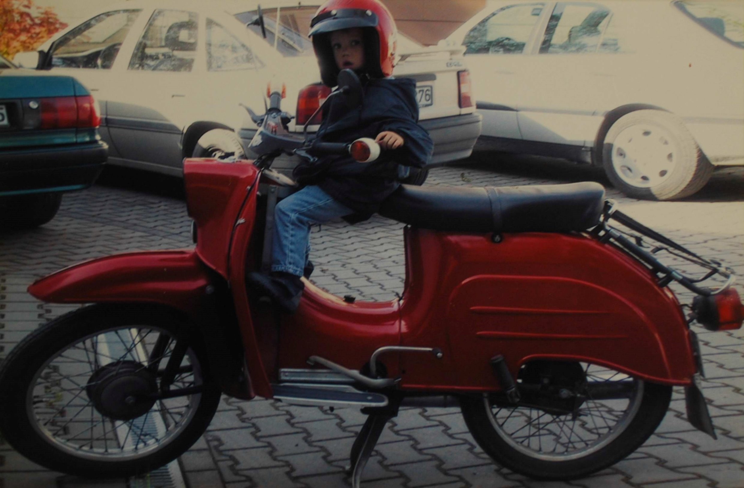 Ich werde kein 3 Personen Bild einstellen, weil ich mit Bildern von mir im Netz etwas vorsichtig bin und auch kein Kleinkind für ein aktuelles Bild in passender Größe zur Verfügung steht. Hier damit man sich das Vorstellen kann, trotzdem ein eingescanntes Papierbild aus ca 2000 von meinem damals zweieinhalbjährigen Sohn, der durchaus auch für eine 100 bis150 km Strecke vom Weserwald bis in den Vogelsberg auf kleinen Landstrassen zu einem Freund gut war.