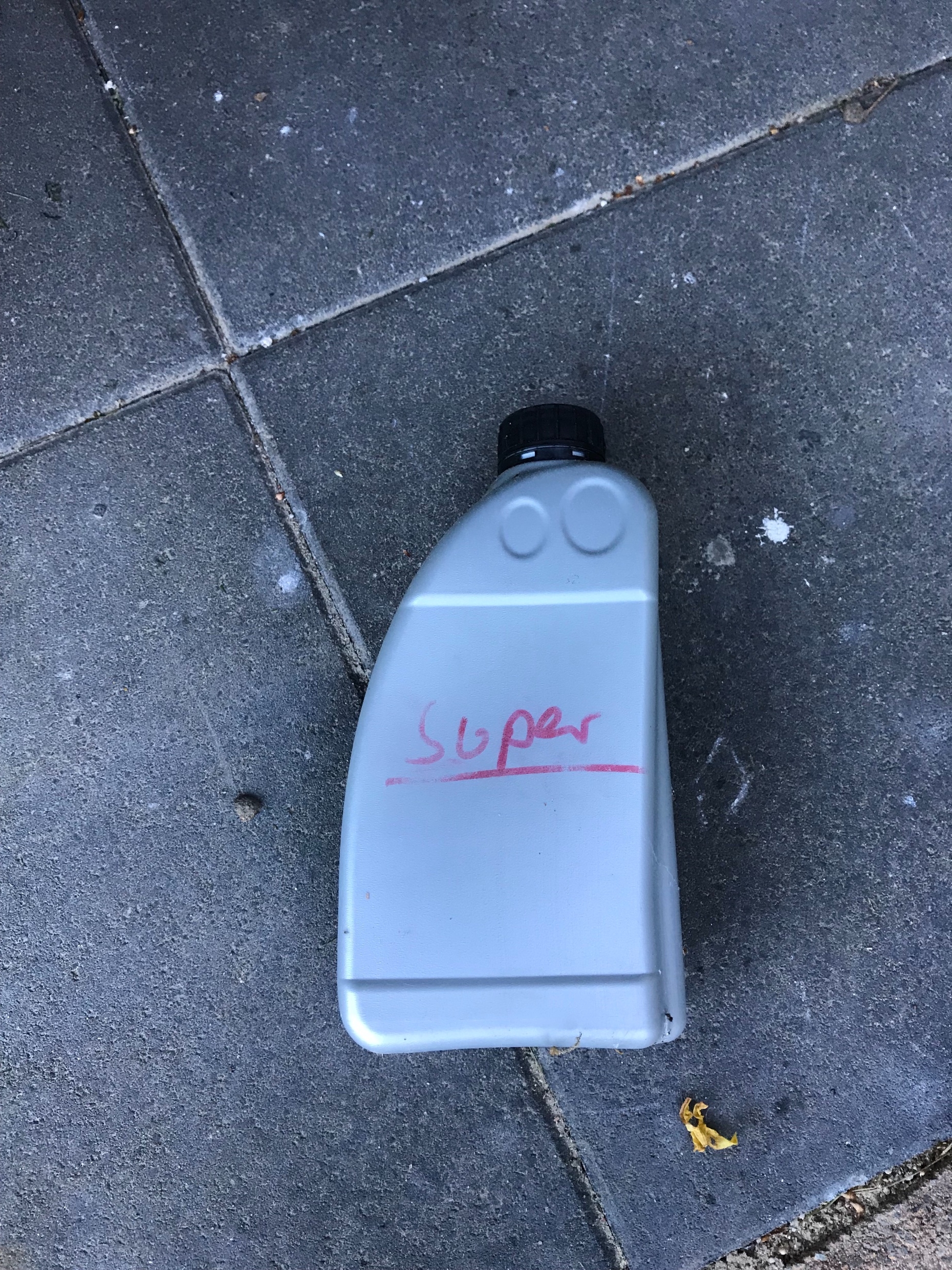 Weiterhin habe ich eine 1-Liter Kunststoff-Flasche im Dauertest, und zwar eine Plastikflasche für 2-Taktöl.