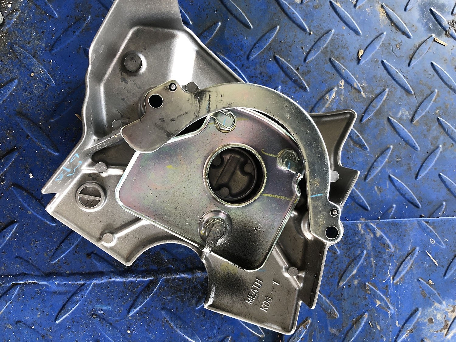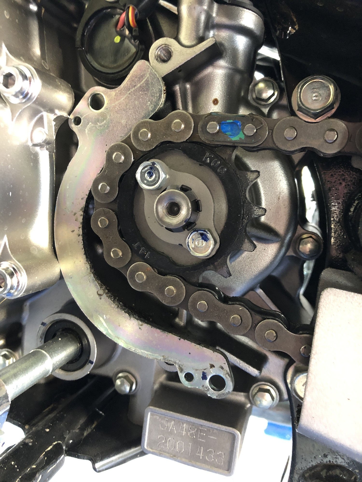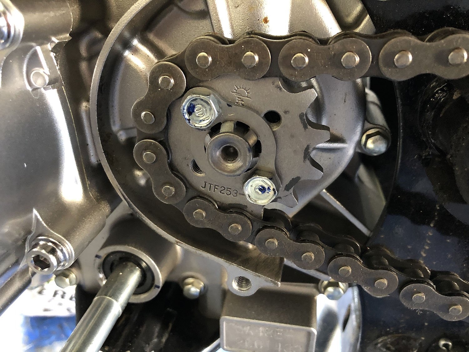 Sehr erstaunt war ich über die Komplexität der Ritzelabdeckung. Nicht einfach ein Deckel wie üblich, sondern ein ausgetüfteltes Konstrukt. Unter anderem mit irgendeinem halbmondförmigen Eisen, dessen Sinn und Zweck ich noch nicht kapiert habe. Tipps sind herzlich willkommen. Kettenschutz fürs Motorgehäuse? Weil es aber (mir zumindest) unmöglich ist, dieses Blech gemeinsam mit dem Deckel zu verschrauben, ohne dass es runterfällt, habe ich es kurzerhand am Deckel festgeklebt.