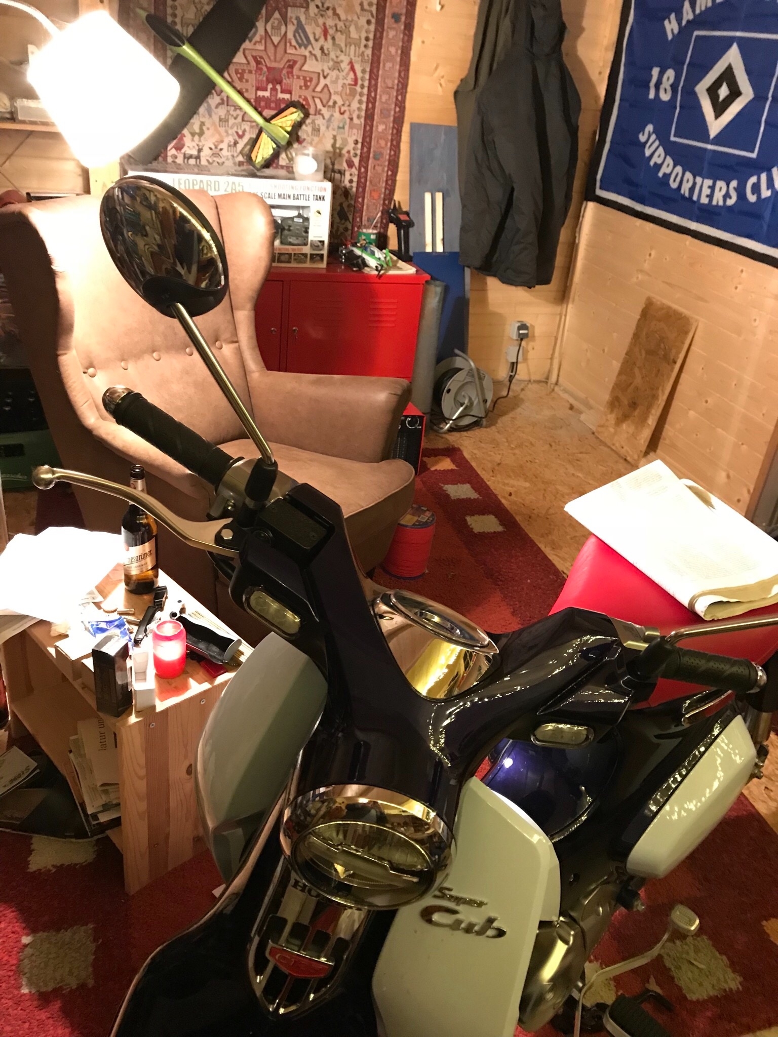 Man braucht nicht viel zum Leben. 2 bis 3 Mopeds, bisschen Bier, Spielzeug, Werkzeug farblich passend zum Fahrzeug,ne warme Hütte, was will man mehr.