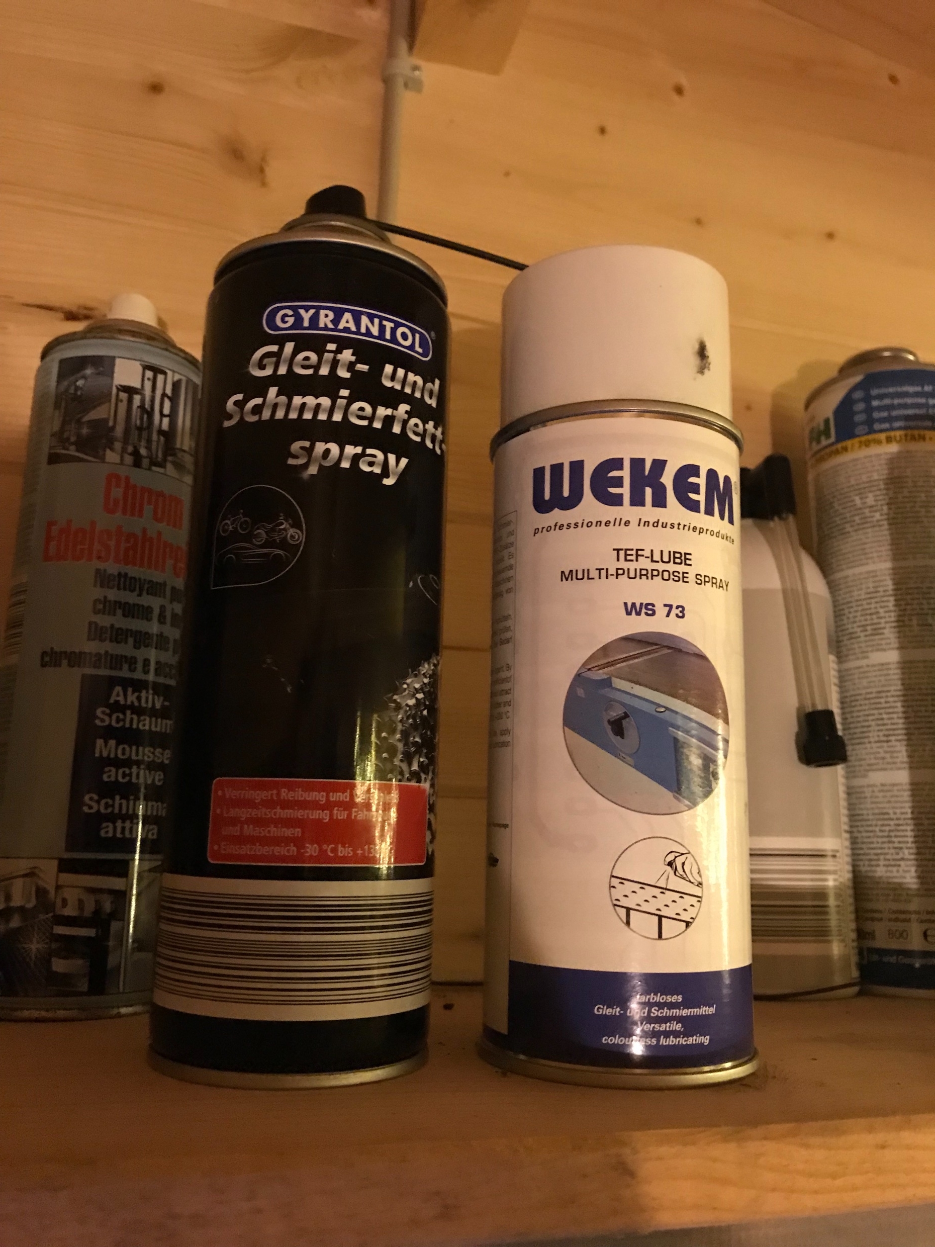 So, Freitag, Fahrzeugwechsel, Helmwechsel, und Kettenpflege. Ich hau da einfach durch die runde Öffnung im Kettenkasten ein paar Sekunden Wekem Tef Lube WS 73 auf die laufende Kette rauf und fertig. Hab ich geschenkt bekommen, soll gut sein, oder wenigstens besser als das Kettenfett von Norma. Sollte eine SuperCub aushalten, selbst wenns falsch wäre.