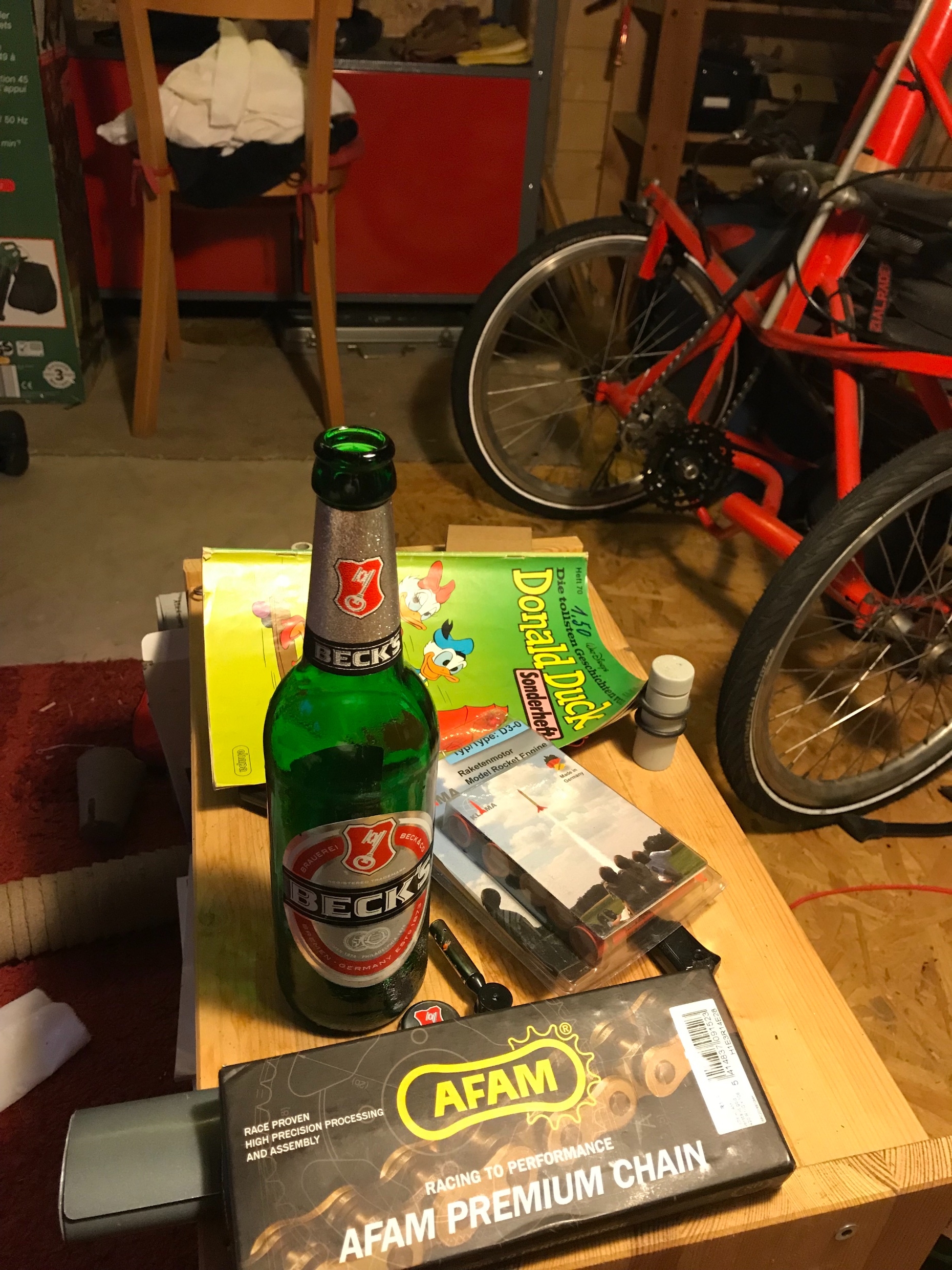 Und wenn es ganz übel ausgeht hab ich eine Reservekette, die angeblich nie nachgespannt werden muss und ewig hält. Mal gespannt.