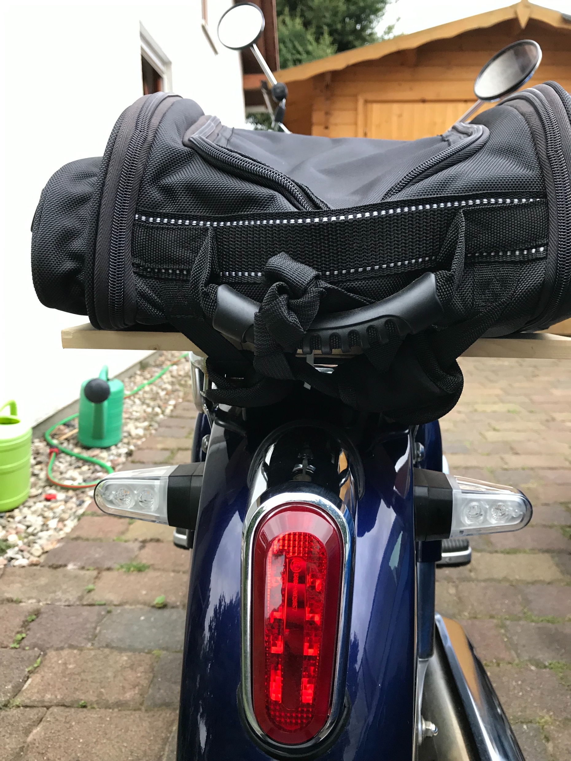 Q-Box Tasche lässt die Seiten herunterhängen, Holzbrett mit Kabelbinder am Chrom- Gepäckträger schafft Abhilfe, mal sehen wie ich das dauerhaft hübsch hinkriege. Brett in der Tasche hilft nicht, oder müsste man einnähen. Vielleicht einfach schwarz anpinseln, oder ein Stück Carbonfaser Rohr einnähen