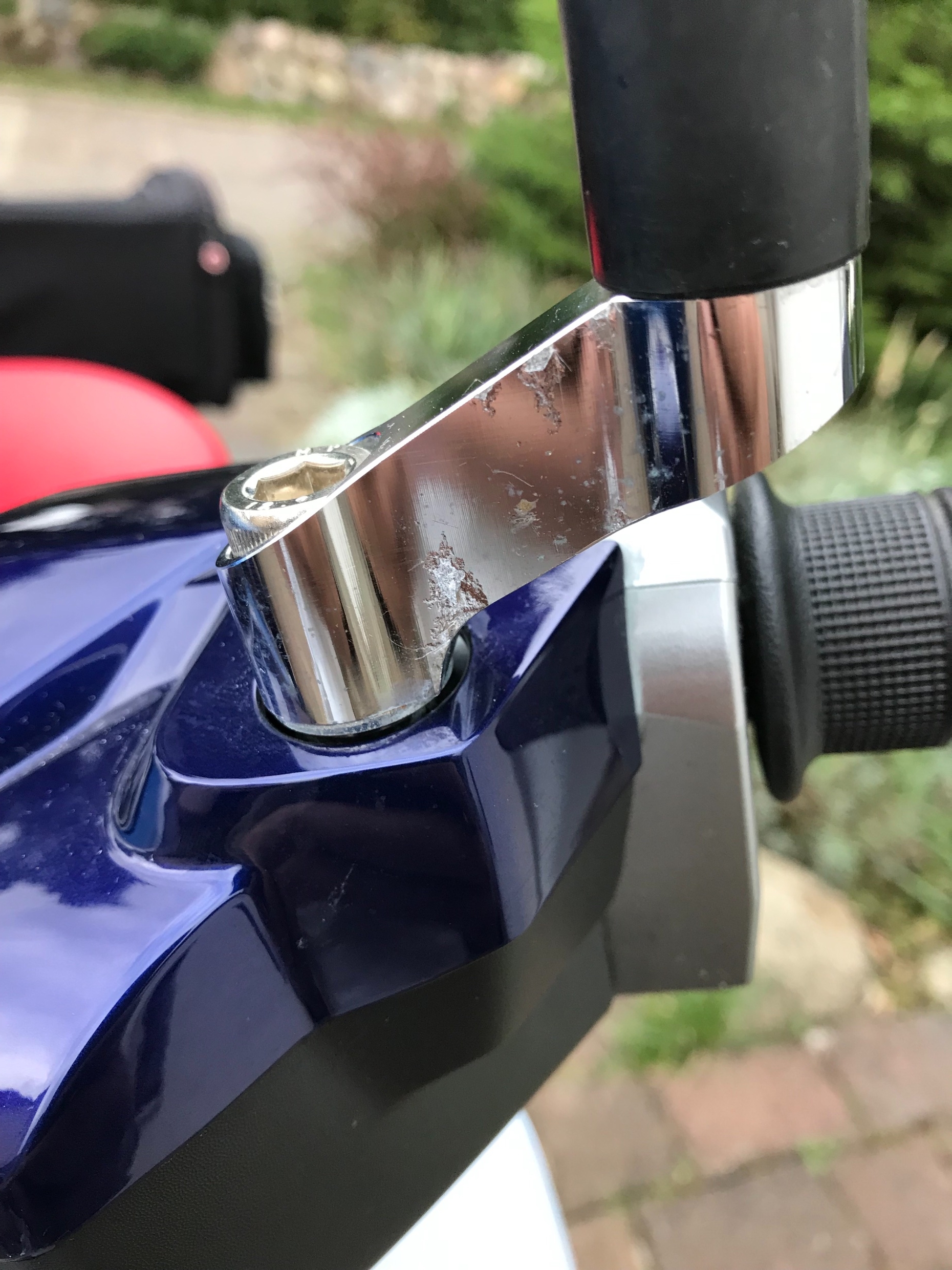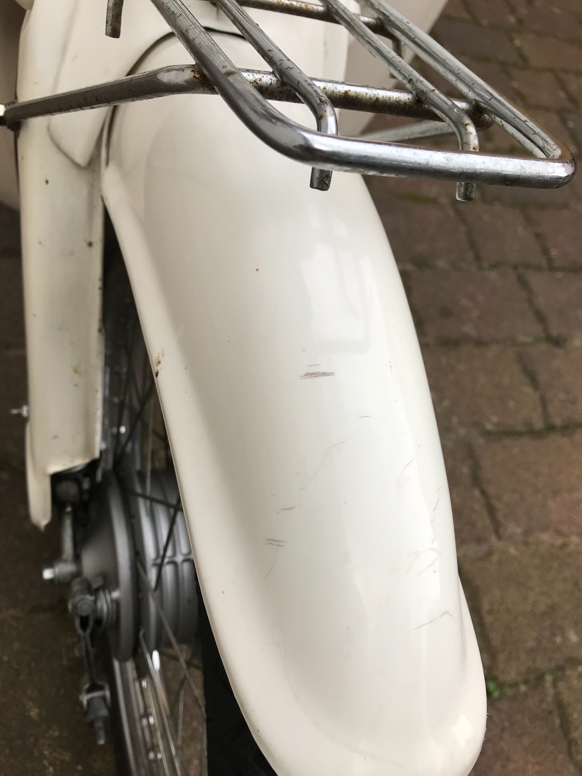 Dabei habe ich entdeckt, dass bei der Spiegelverbreiterung einer meiner Schönwetter- Garagen SuperCubs die Verchromung(?) abbröselt. Original Zubehörteil Honda.