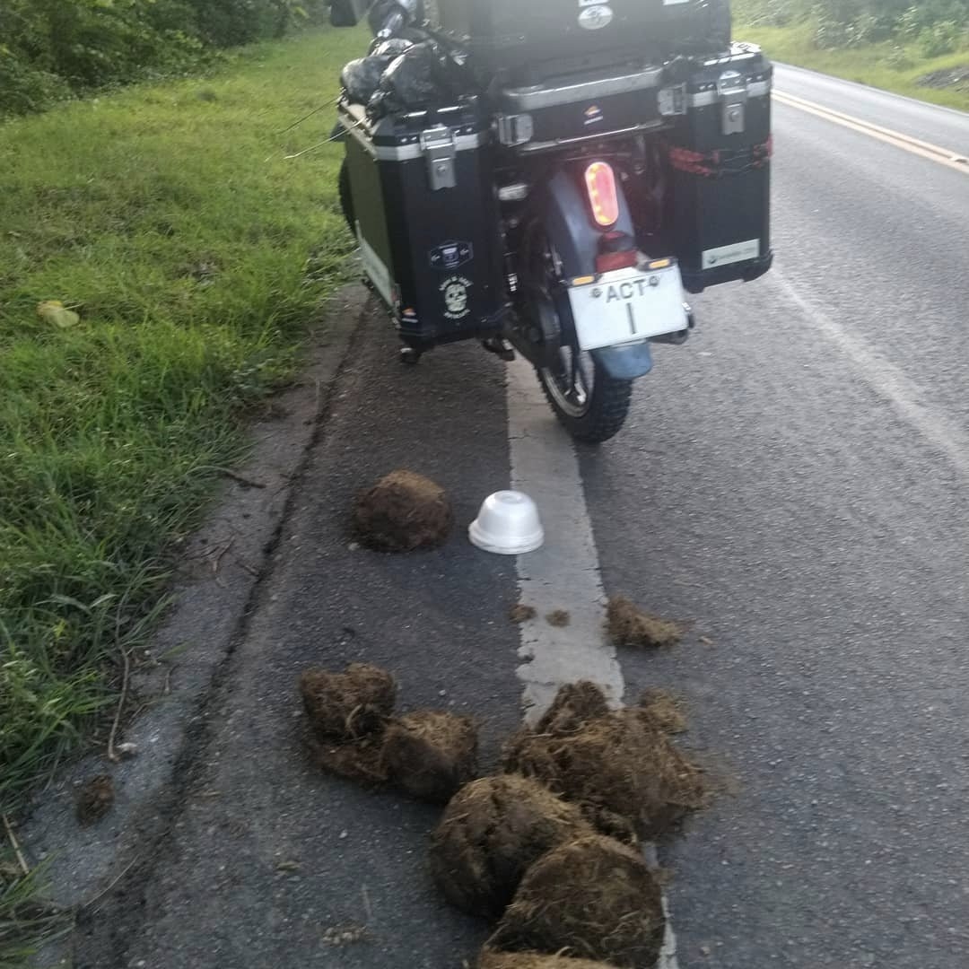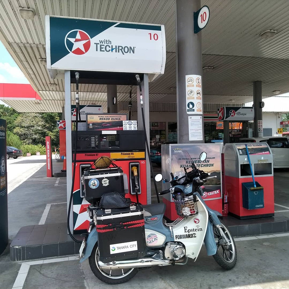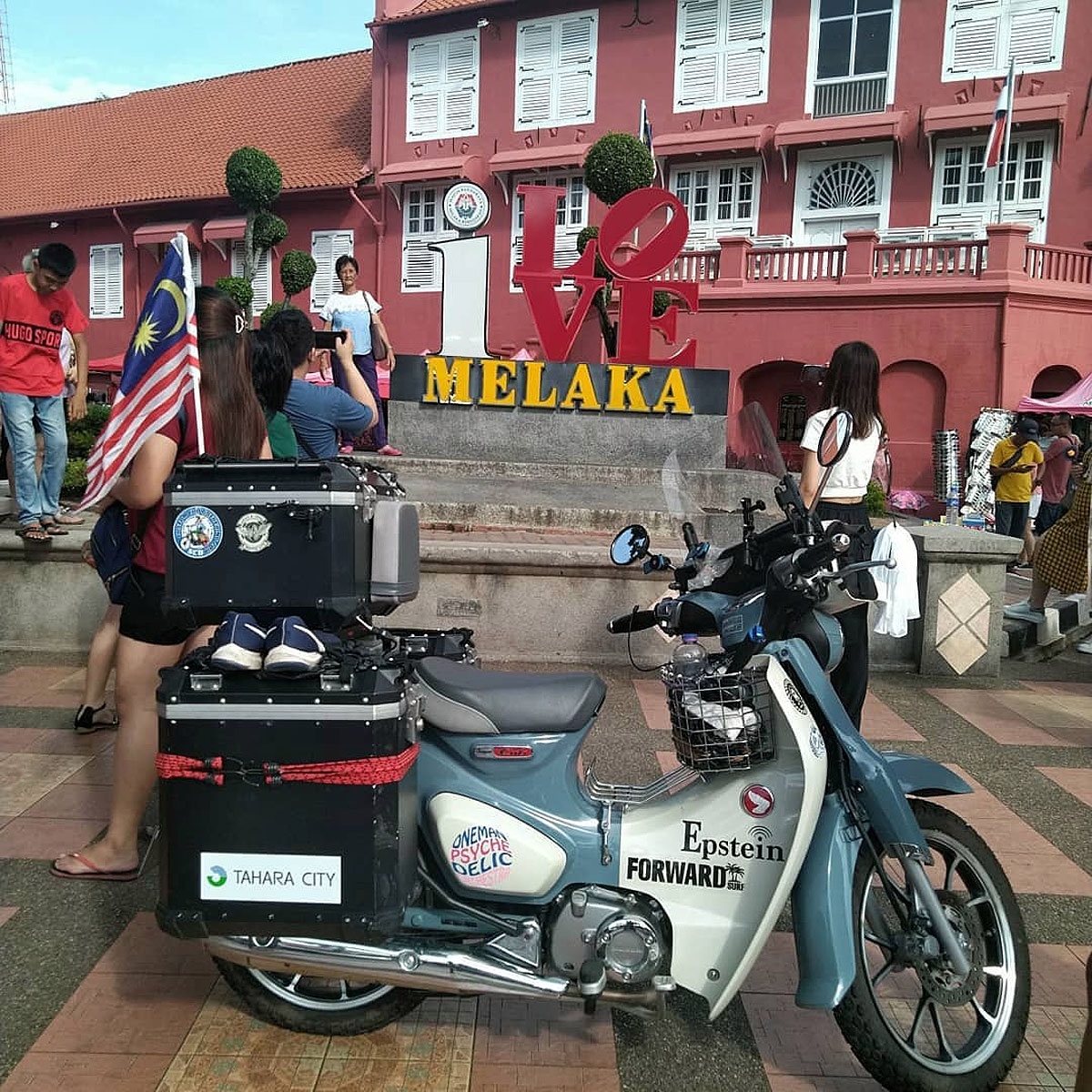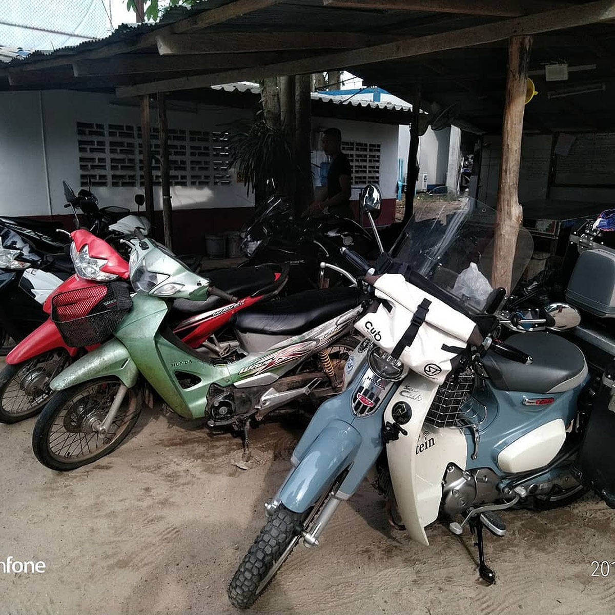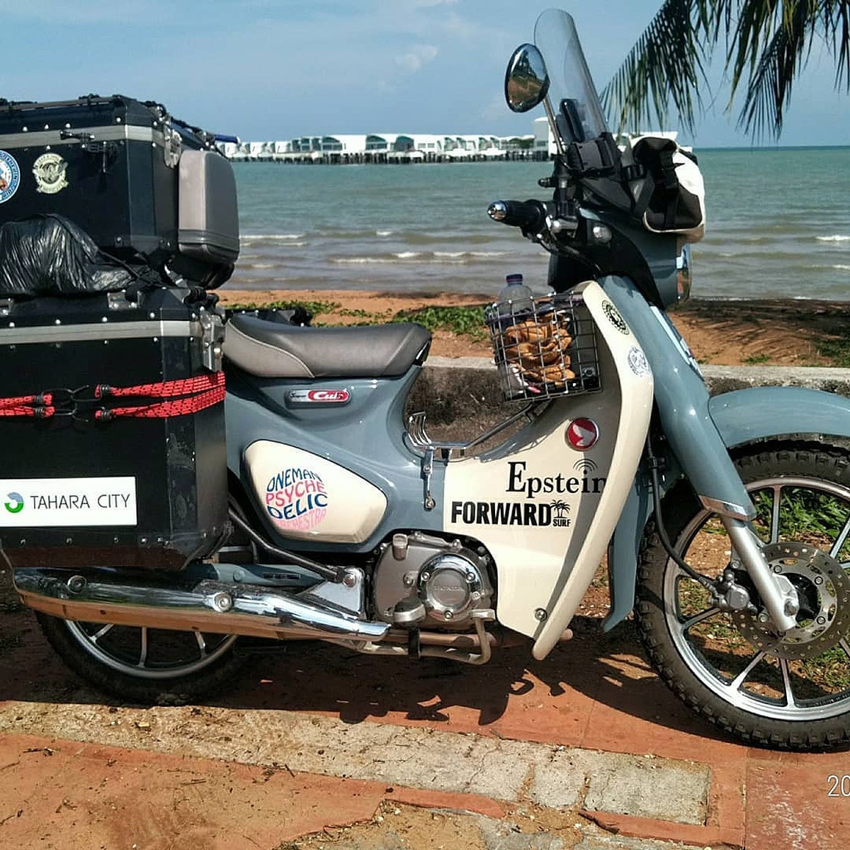 Nachdem der SC 125 ja von Außenstehenden gerne die Praxistauglichkeit abgesprochen wird (nur 5 Kilo Zuladung! Keine Soziusrasten! Und der Preis!) hier aus gegebenem Anlass ein paar Bilder. Hintergrund: Ich habe mich virtuell mit einem netten Japaner befreundet, der auf einer in Thailand gekauften Super Cub nach Europa fahren will. Wie weit er kommt, weiß ich bis heute nicht, weil er seit April durch Südostasien tourt. Immerhin, Thailand, Vietnam, Kambodscha, Myanmar, Malaysia und einen Schlenker nach Singapur hat er schon durch.