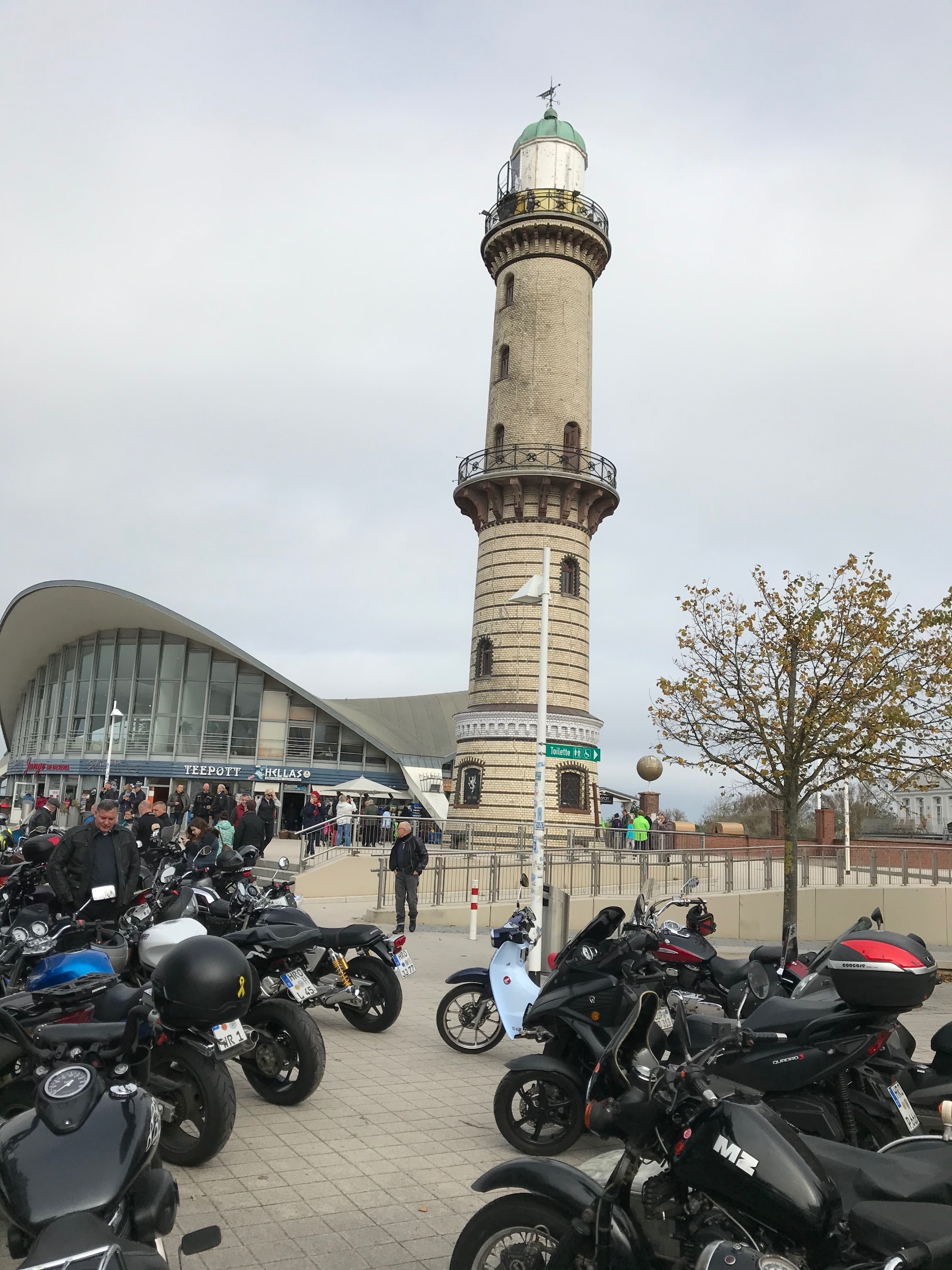 Dann der Korso von vielleicht 100 Maschinen im Zickzack durch die Stadt bis zum Strandbad Warnemünde, am Leuchtturm, dort Pause und Kaffee trinken, und die Maschinen präsentieren.