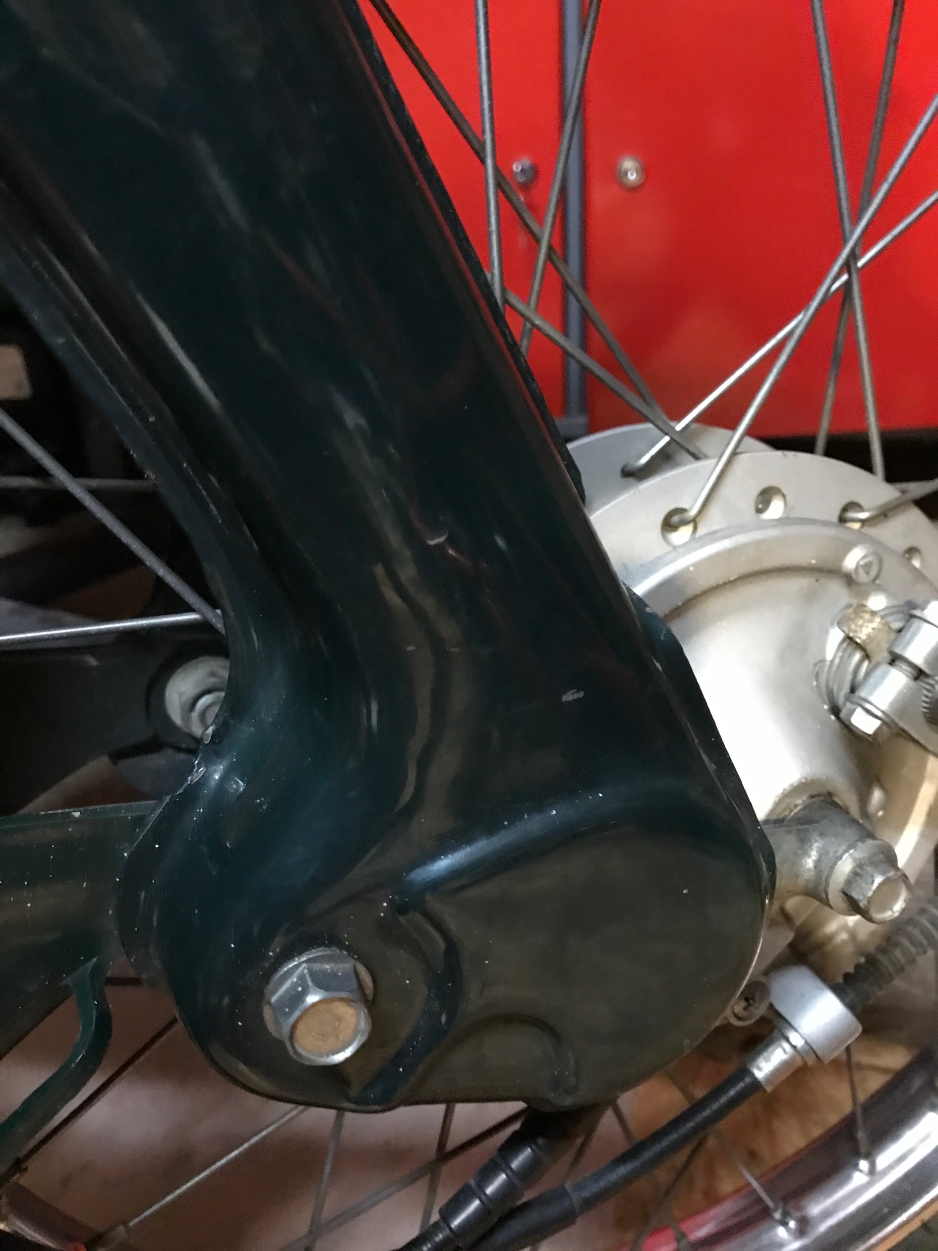 Das zweite Loch bei den Chromdingsen ist bei den ganz alten Cubs für die Schutzblechbefestigung. Dort ist auch der Federarm gelagert mit dem außenliegenden Schmiernippel. Die untere Schraube hält den Endanschlag. Siehe das Bild von meinem Wrack: