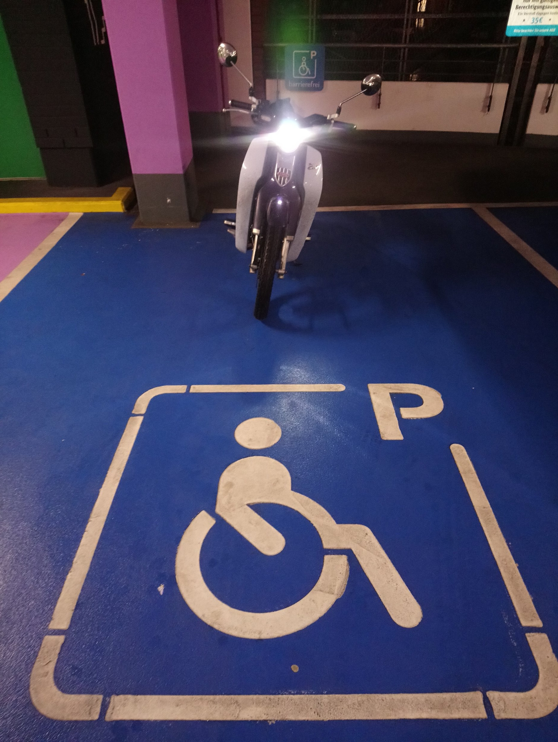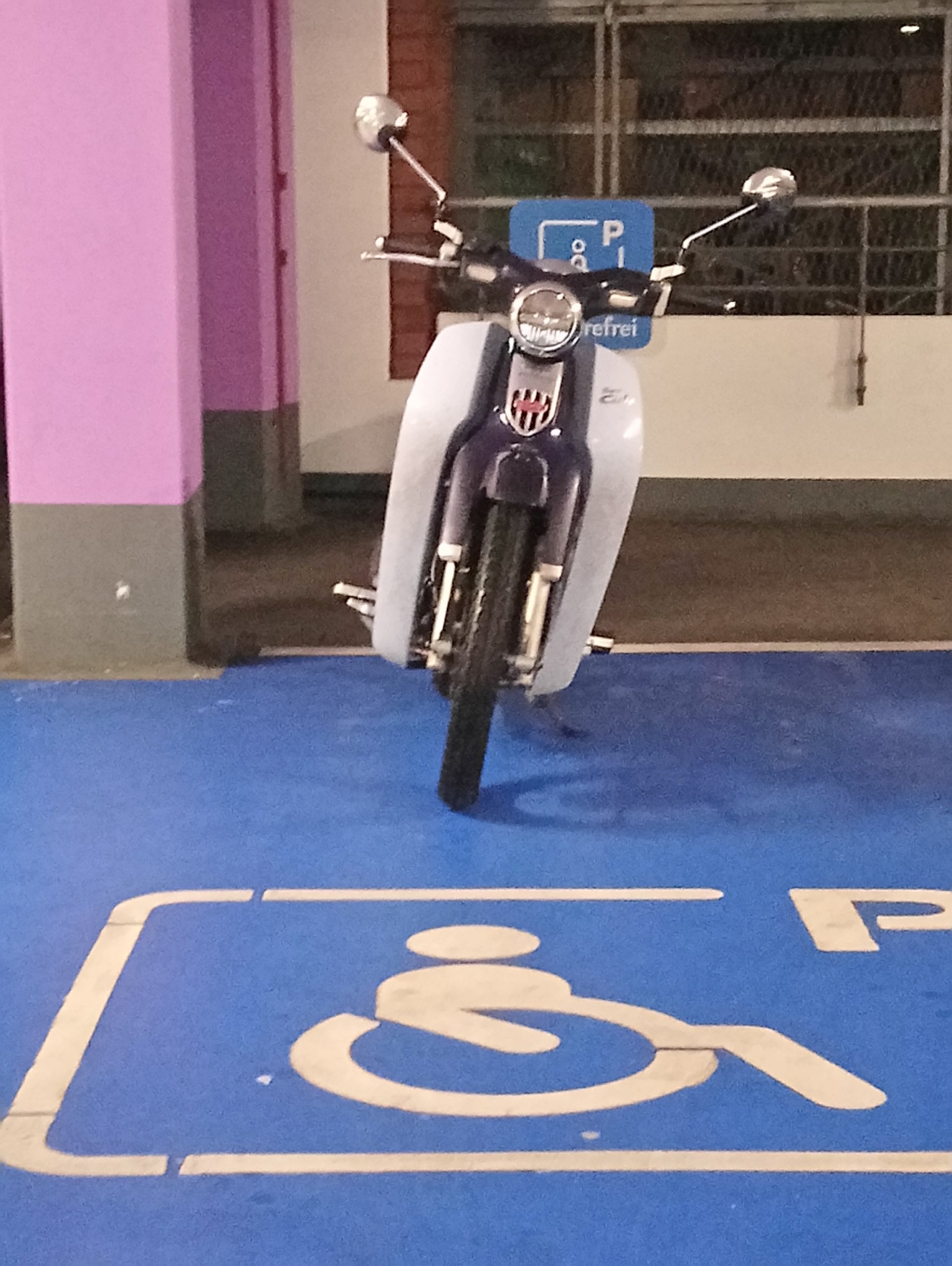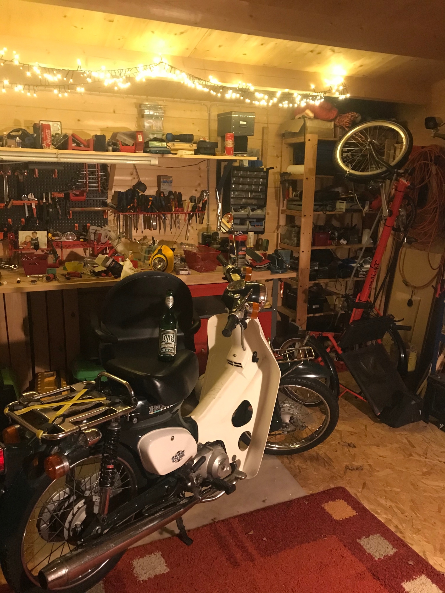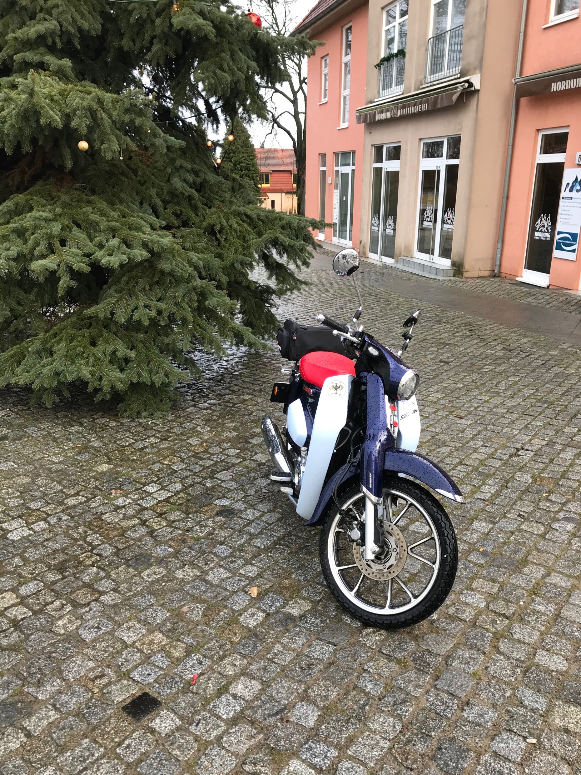 Meine Honda C125A SuperCub, mit neuem Seitenständer, was völlig überbewertet wird, und eigentlich unnütz, mach ich nicht nochmal, ist heute nass(!) geworden, hat hoffentlich keine Folgen.