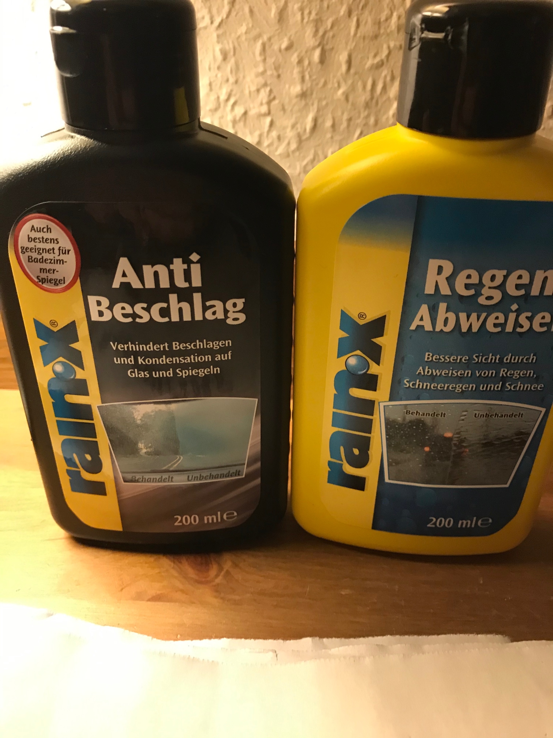 Rain-X ist super auf der Auto-Windschutzscheibe, kannst ab 60-70 den Scheibenwischer auslassen bei Regen.