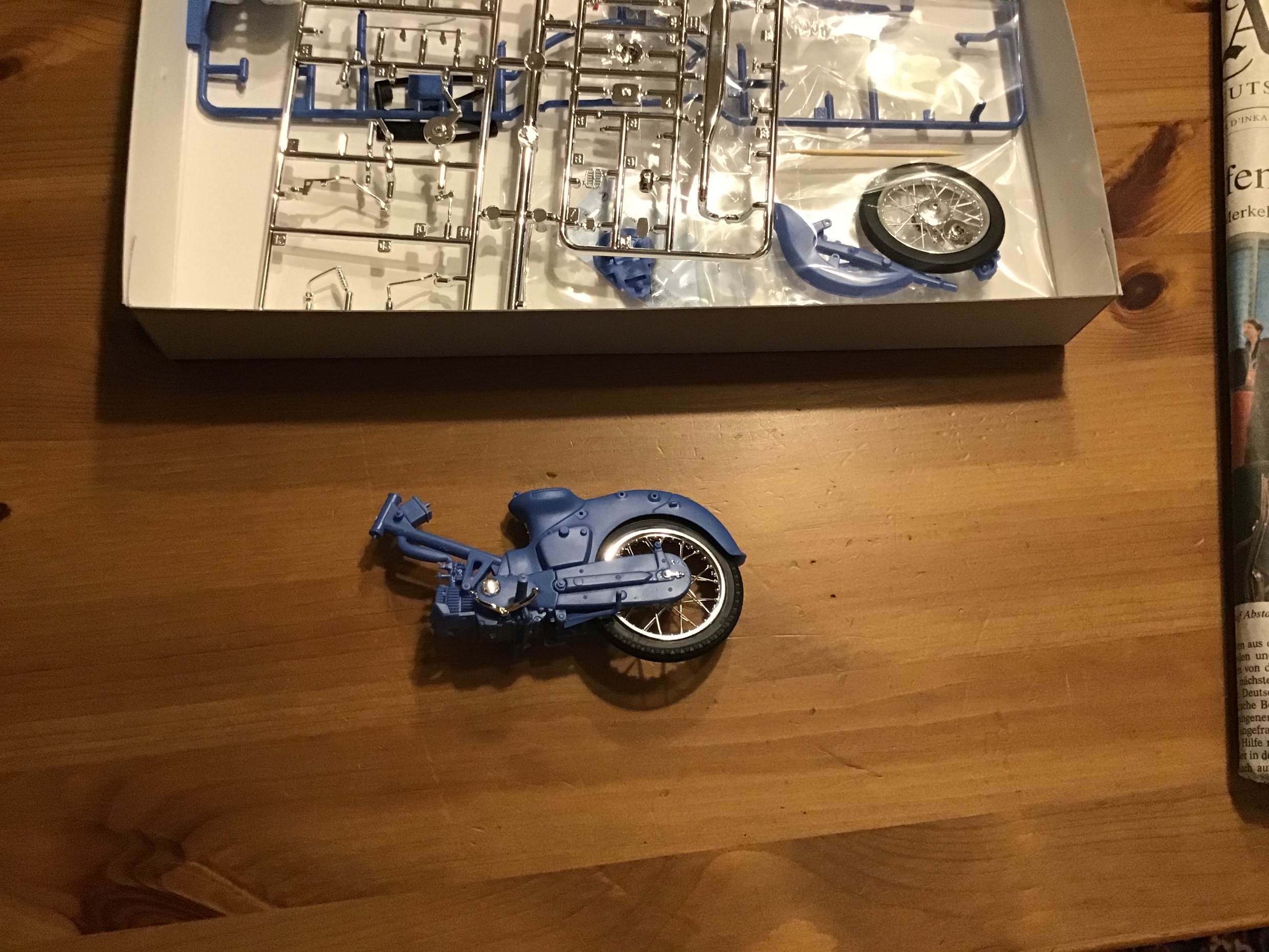 Der Sattel wurde mit gummiartigem Sprühzeugs bearbeitet, kommt realistisch rüber, bilde ich mir ein. Ist ja immerhin von 1958 oder so Das größte Gefummel war der Millimetergrosse Kettenspanner, hinten links