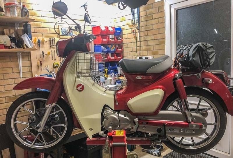 Hier würde mich interessieren, ob man eine SuperCub wie hier gezeigt, ohne weiteres, also nicht auf Hauptständer, auf so einem billigen Werkstattständer aufbocken kann (steht die Maschine so auf dem Motor?)