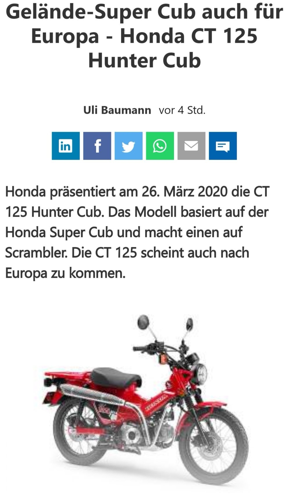 Insgesamt gefällt mir die CT125 schon deutlich besser als die C125. Aber auch falls sie nach Europa kommen sollte, in der Leistungsklasse kaufe ich nichts mehr. Da reicht mir die Wave noch lange. Und zu teuer würde sie sowieso. ;)