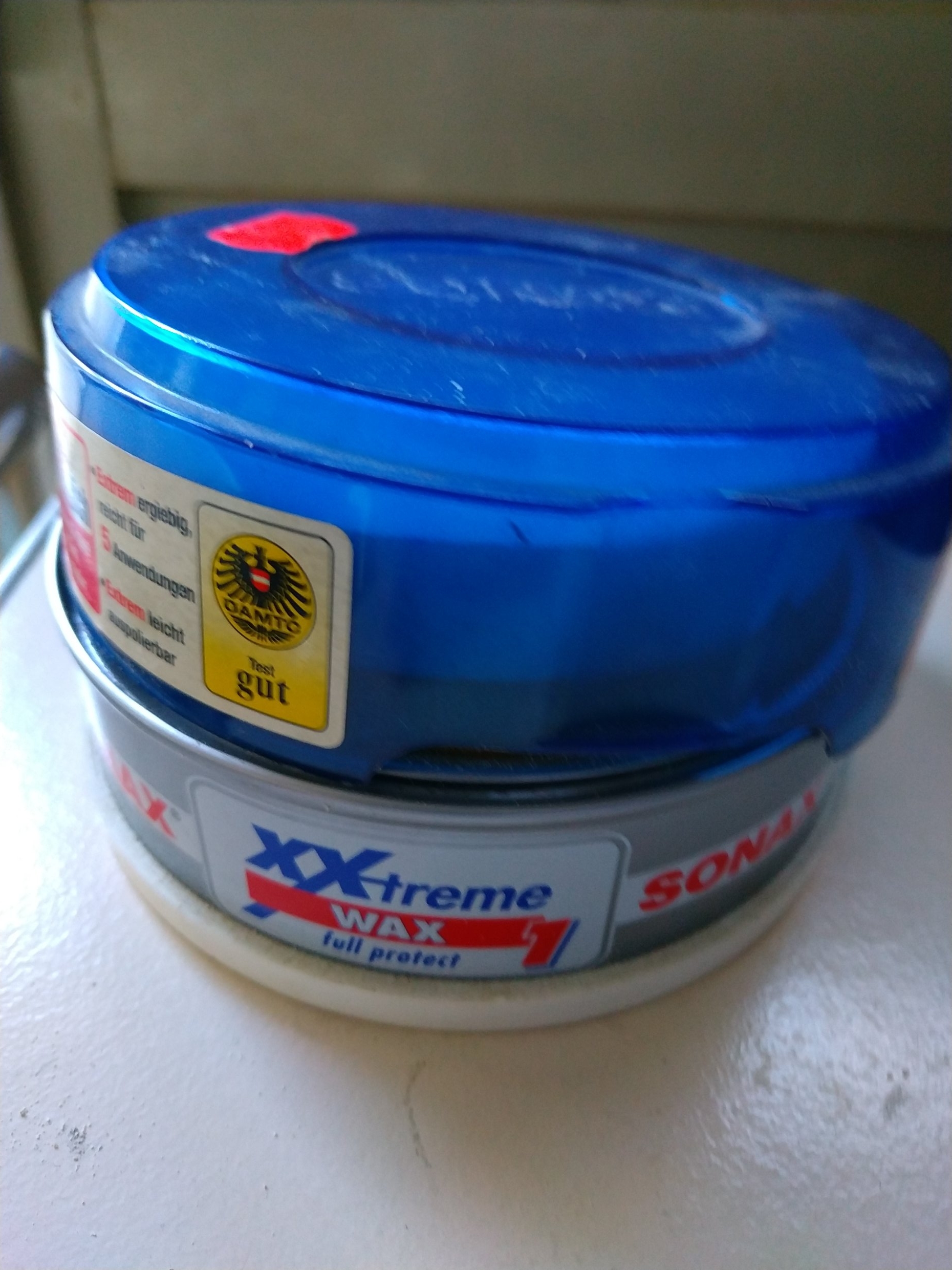 Ich habe das noch im Keller gefunden. Anscheinend reines Carnauba Wachs ohne Schleifmittel. Es war noch nicht mal eingetrocknet.