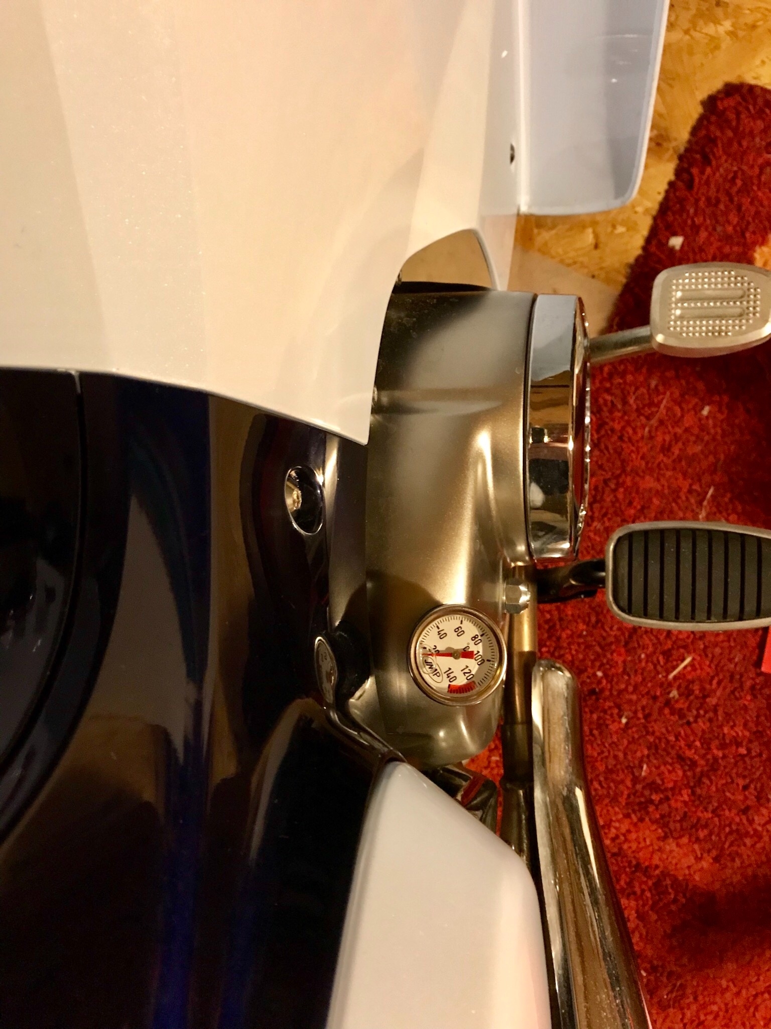 Heute Ausfahrt nach Lübz unternommen, kleiner Ort etwa 20 km entfernt. Das Ölthermometer, das bei 20 Grad beginnt, hat sich die ersten 10 km nicht gerührt, bei ca 15 km stand es auf 30 Grad, und das höchste nach 45 km war 42 Grad. Bei ca 3 Grad Aussenthemperatur, 60-80 kmh.