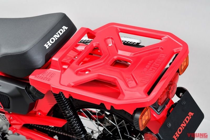 The CT125 is a concept model which proposes the new value of the Honda Super Cub series through its structure, designed while giving due consideration to off-road run-through performance, and the exterior design, which stimulates the adventurous spirit of riders. Inheriting the original “CT” concept, the CT125 features a steel front fender and up-muffler (above the engine), a wide and large rear carrier, high-mount air intake duct and side air cleaners and yet realizes simple and unique styling. While featuring a casual characteristic suitable for everyday use, the CT125 is positioned also as a trekking bike which is equipped with functions that enable the rider to enjoy it in the outdoors.