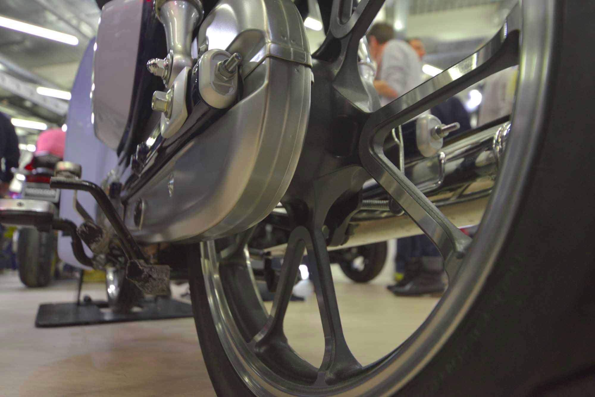 Reifen: 70/90 -17 Vorne? 80/90-17 Hinten. Optisch sah das Hinterrad kleiner aus wie das Vordere.
