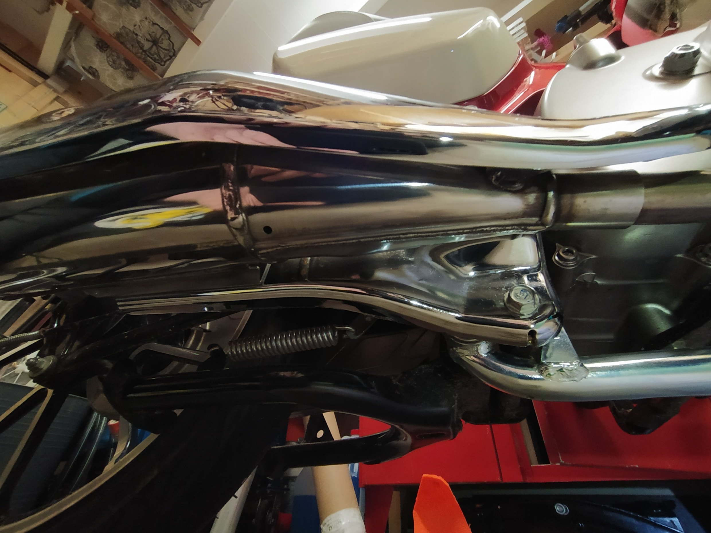 "So nun zu den Fotos man kann sehen das es eine Öffnung an der Trägernunterseite ( vom Auspuff ) gibt damit evtl. eindringende Feuchtigkeit dort wieder austreten kann. So das keine Feuchtigkeit drin bleiben kann. Der das Material nur von außen behandelt ist und nicht von innen behandelt ist kann es schon mal passieren das die Feuchtigkeit die austritt leicht röstlich ist.