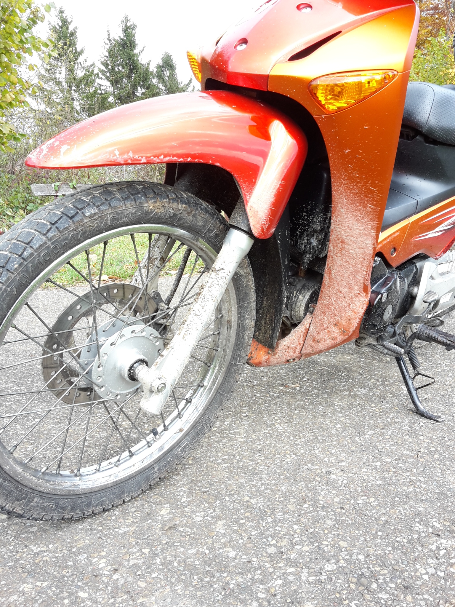 Die zweitperfekte Tarnung, nach der Mofanummer, ist das große Windschild und Topcase, die nicht unbedingt auf einen wilden Motocrosser schließen lassen.