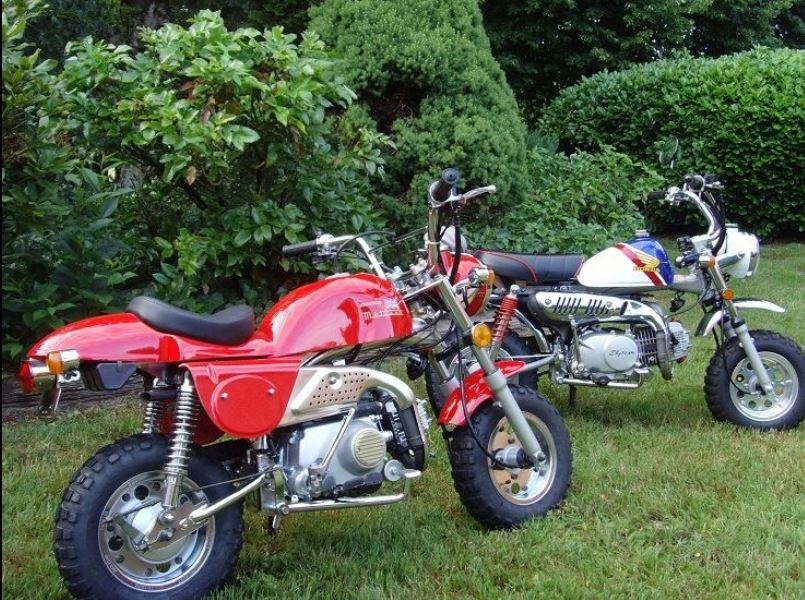 Honda Super-Cub in einer Reihe mit Suzuki GSX-R 750, Honda Goldwing, Honda XLV750R und Ducati Paso 750.