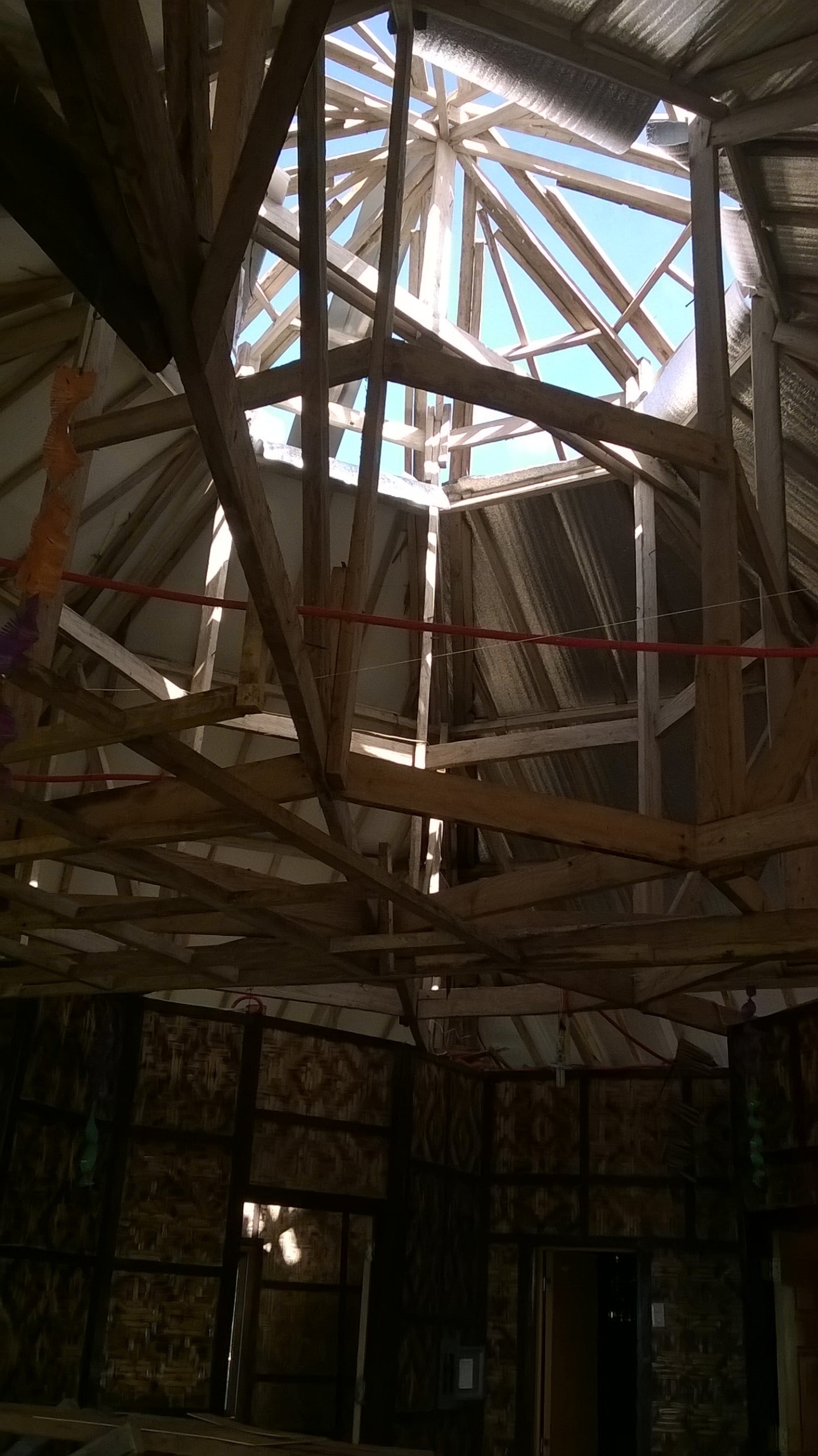 Das alte Dach war mit Nippa gedeckt. Ich wollte das explizit so und das gegen die Ratschläge der Locals. Ich wollte ein Haus das ganz im rural native Style dasteht. Aber ein Nippadach dicht zu kriegen UND es auch dicht zu behalten ist eine Heidenarbeit und ist sehr aufwändig. Dazu muss es auch regelmässig ausgewechselt werden. Was dann wiederum eine Riesensauerei verursacht. All das und noch ein paar andere waren die Gründe warum ich mich dann doch für ein Colorroof entschieden haben.