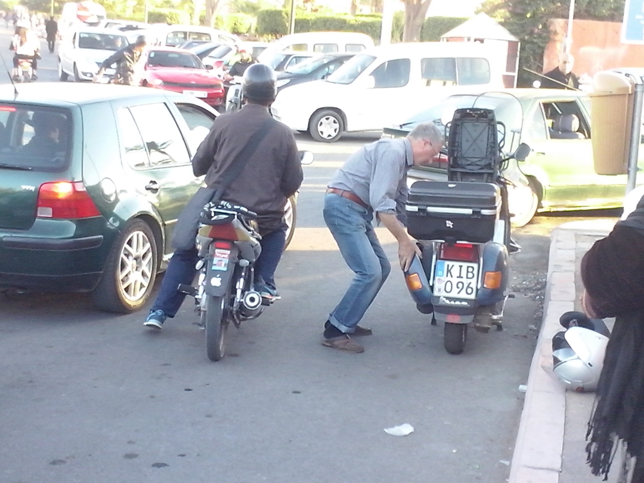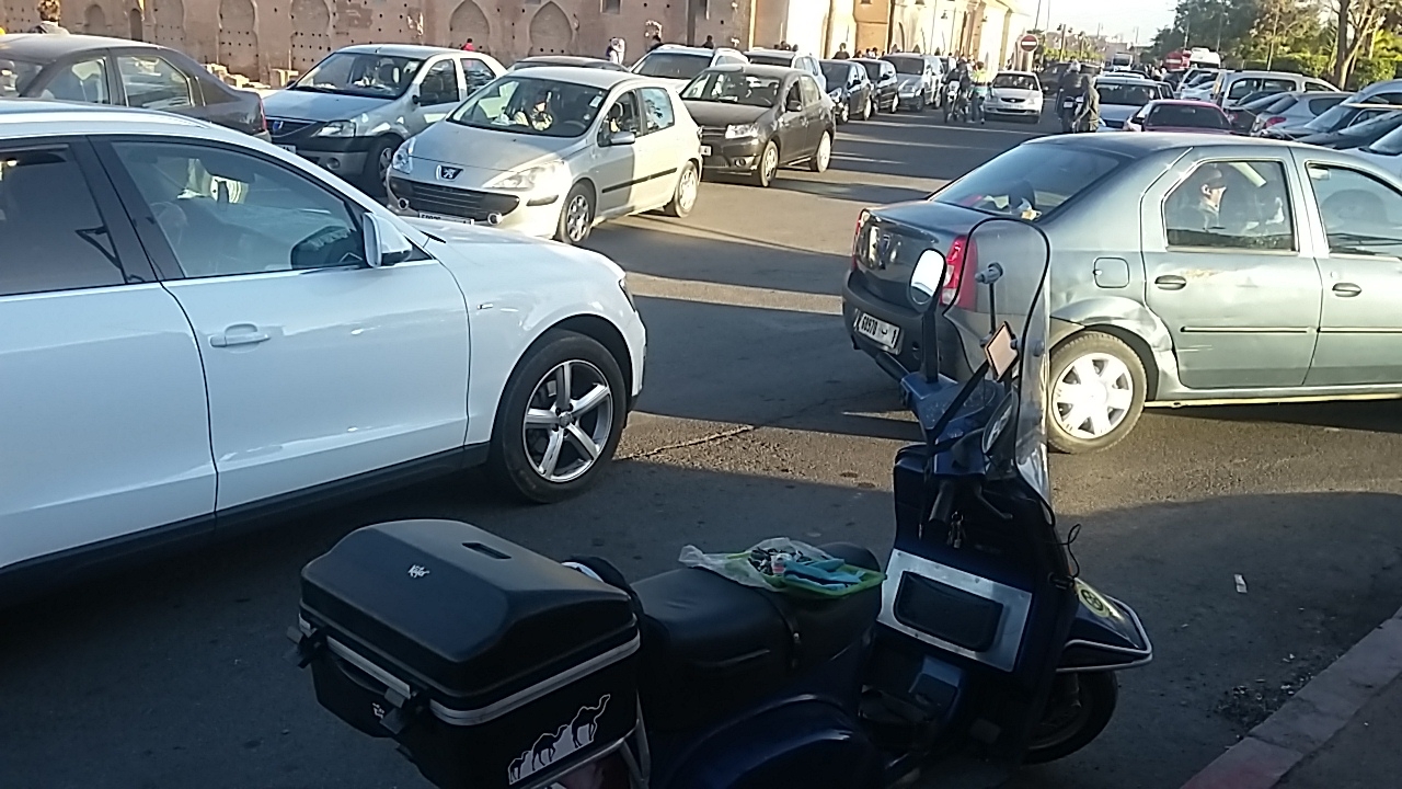 In Tafraout /MA. Die gehört einem Franzosen und auf der anderen steht "New Wave". Hinten Scheibenbremse. Ccm?