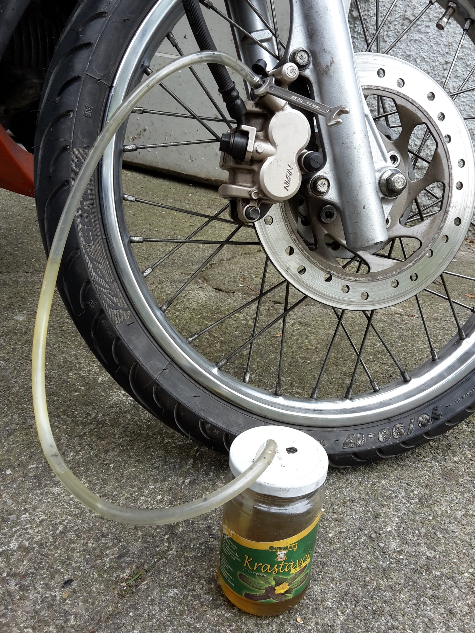 Einer pumpt und kann dabei den Gummiadapter , der auf der Entlüftungsschraube gesteckt wird andrücken ,